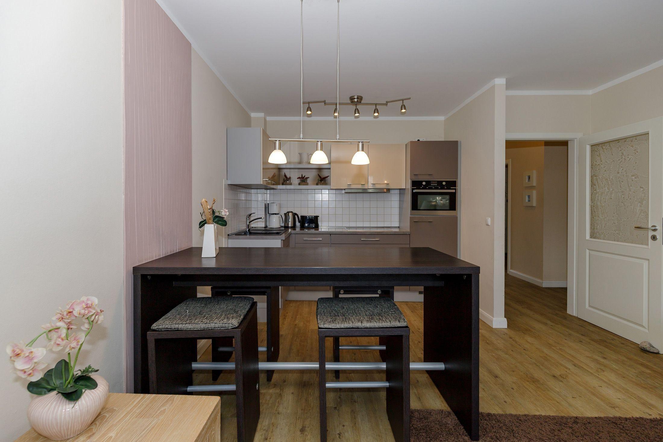 Die offene Küche grenzt direkt an den Wohnbereich. Die Küche ist voll ausgestattet, vom Besteck über Geschirr bis hin zu diversen Küchenutensilien. Natürlich ist auch eine Kaffeemaschine, ein Toaster, Wasserkocher, Cerankochfeld, Backofen, Kühlschrank und Geschirrspüler vorhanden.