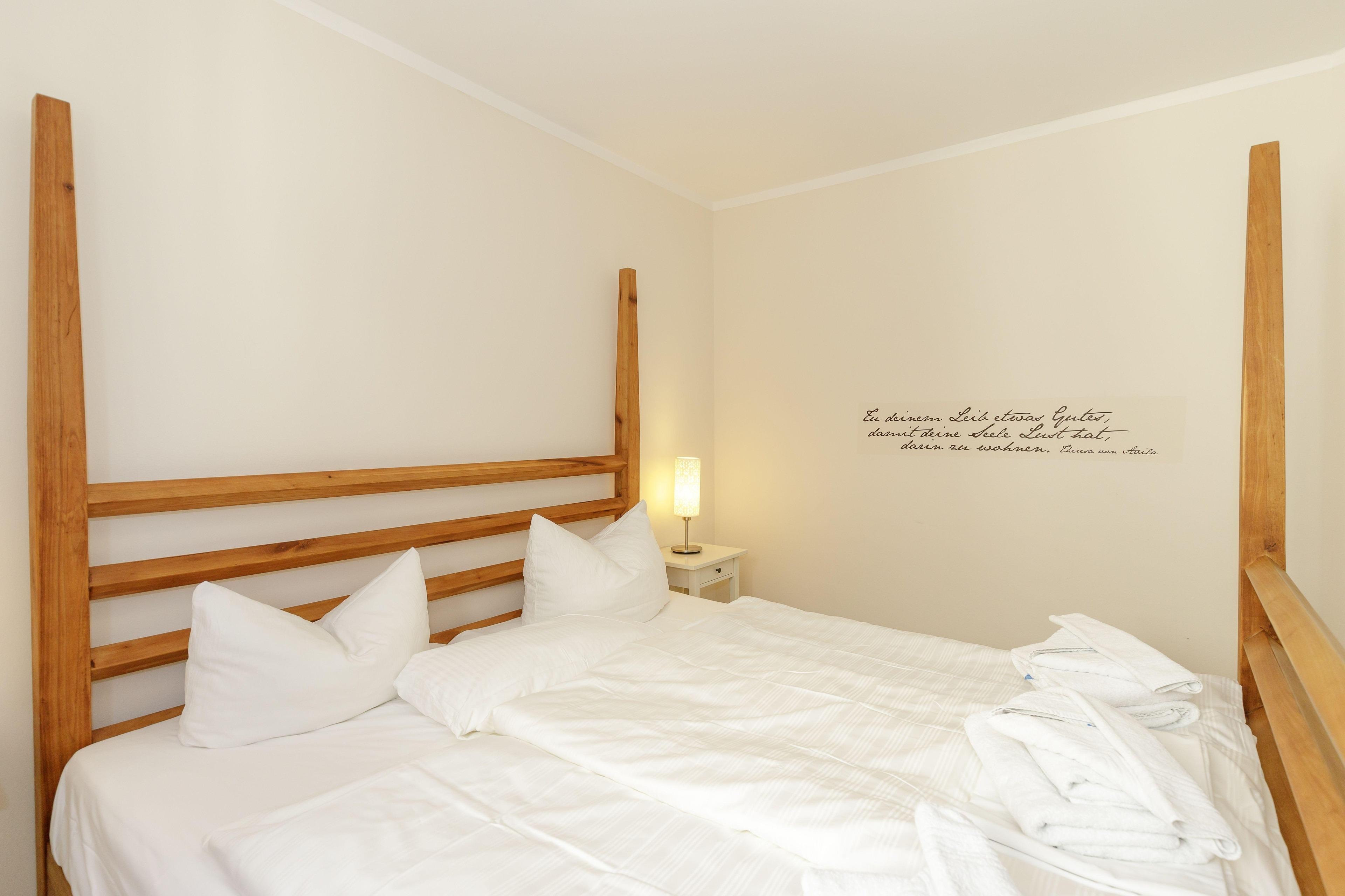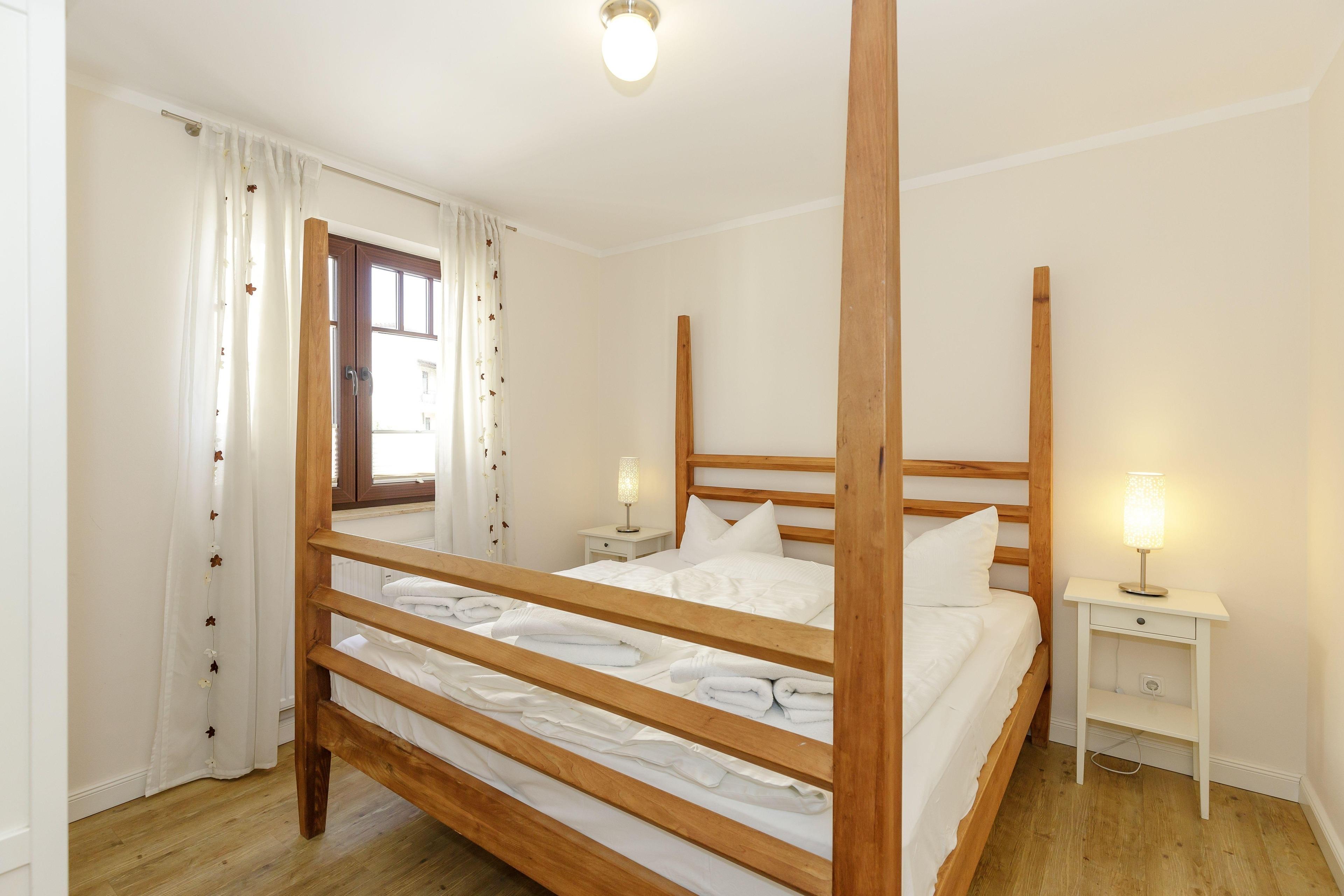 Im Schlafzimmer können Sie im Doppelbett den erholsamen Schlaf finden. Ein Kleiderschrank für Ihre Urlaubsgarderobe finden Sie selbstverständlich auch.
