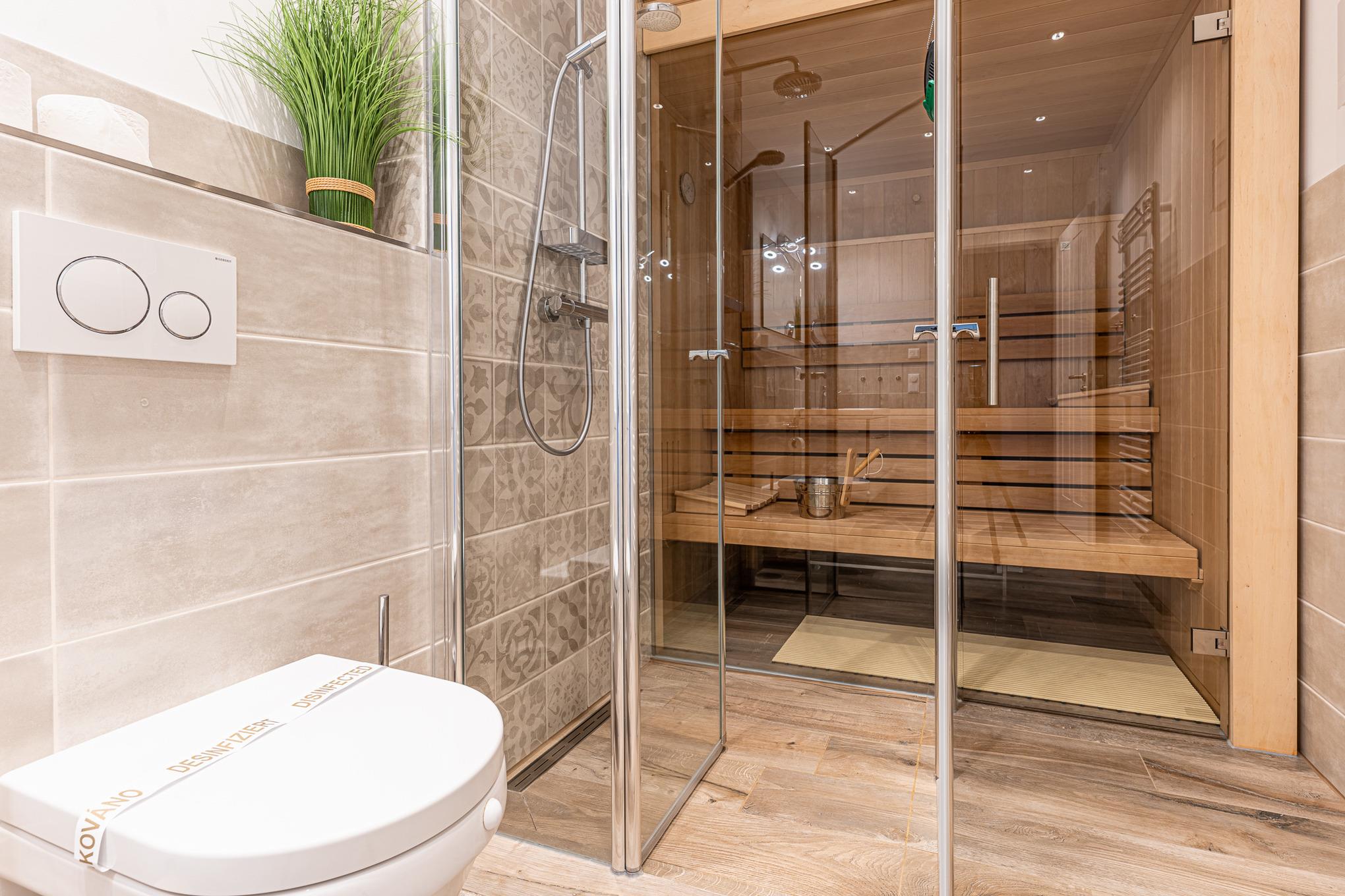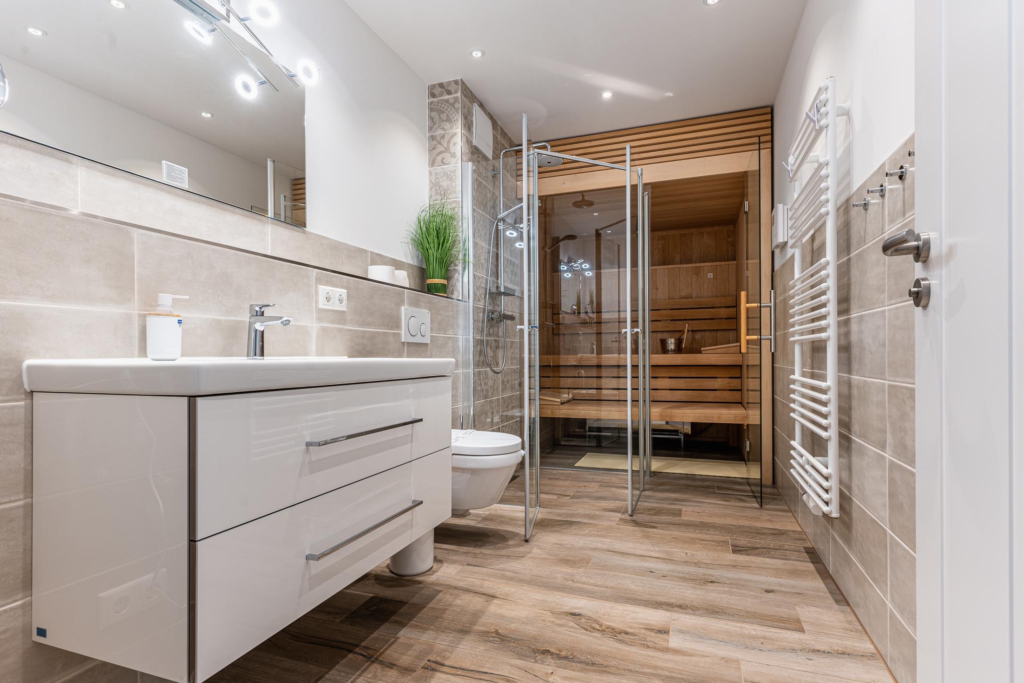 Das moderne Badezimmer verfügt eine begehbare Dusche, WC sowie einem modernen Waschtisch mit genügend Ablagemöglichkeiten, großem Spiegel, Kosmetikspiegel und Haarfön. Über das Badezimmer gelangen Sie in Ihre eigene Privatsauna, welche Ihnen uneingeschränkt zur Verfügung steht. Highlight: Der Saunabereich wird durch eine massive Glaswand abgetrennt, sodass ein ganz besonderes Raumgefühl entsteht.