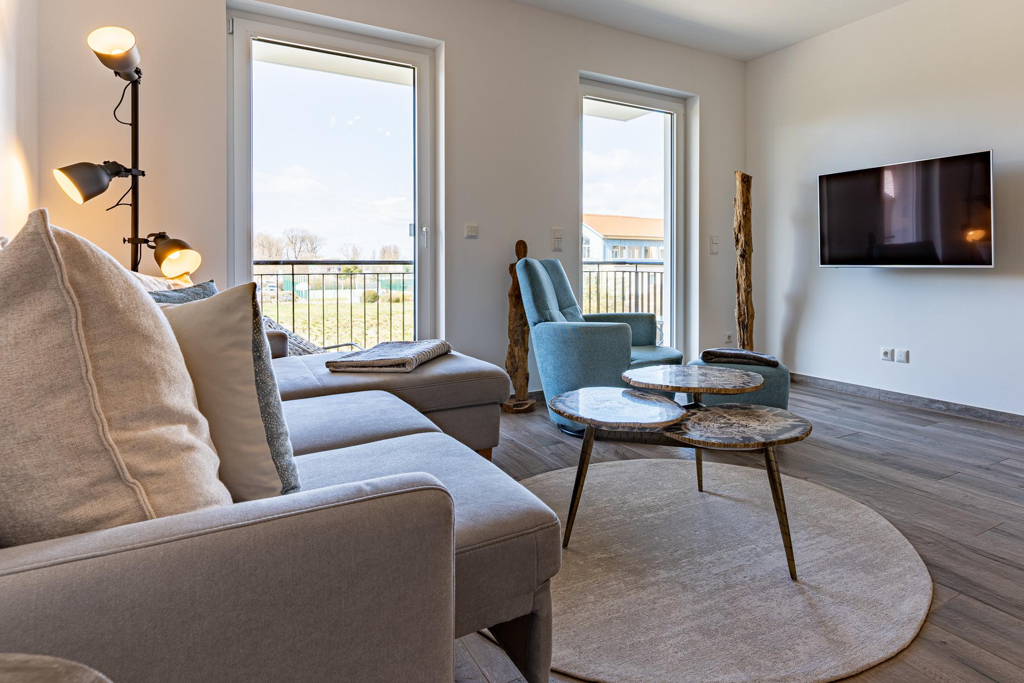 Über den Wohnbereich gelangen Sie auf den großzügigen Westbalkon, auf dem Sie sich nach einem langen Strandtag entspannen oder aber auch den Abend gemütlich bei einem Glas Wein ausklingen lassen können. Gemütliche Stühle sowie ein Tisch laden Sie zum Relaxen und Verweilen ein.