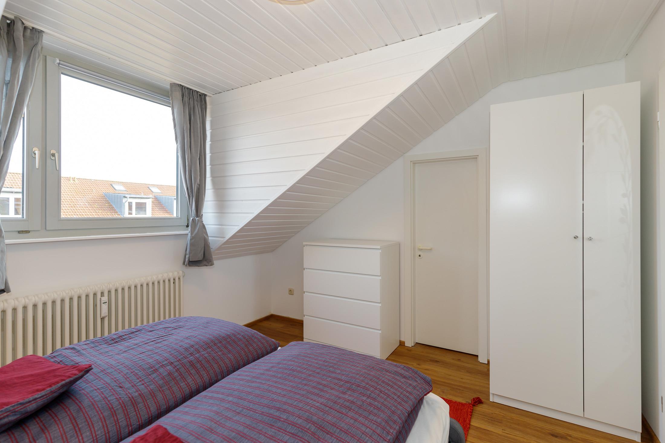 Über eine Treppe gelangen Sie in die beiden oberen zur Nord- und Südseite gelegenen Schlafzimmer, welche jeweils mit einem gemütlichen Polsterbett (1,60x2,00m, durchgehende Matratze), Verdunklungsrollos und einer Kommode und Kleiderschränken ausgestattet sind. Vom Nordschlafzimmer eröffnet sich eingeschränkter Blick zur Ostsee, während das Südschlafzimmer über eine ausziehbare Polstercouch verfügt, die eine weitere Schlafmöglichkeit für eine 5. Person bietet. Im oberen Bereich befindet sich auch das Vollbad mit Badewanne/WC und Haartrockner.