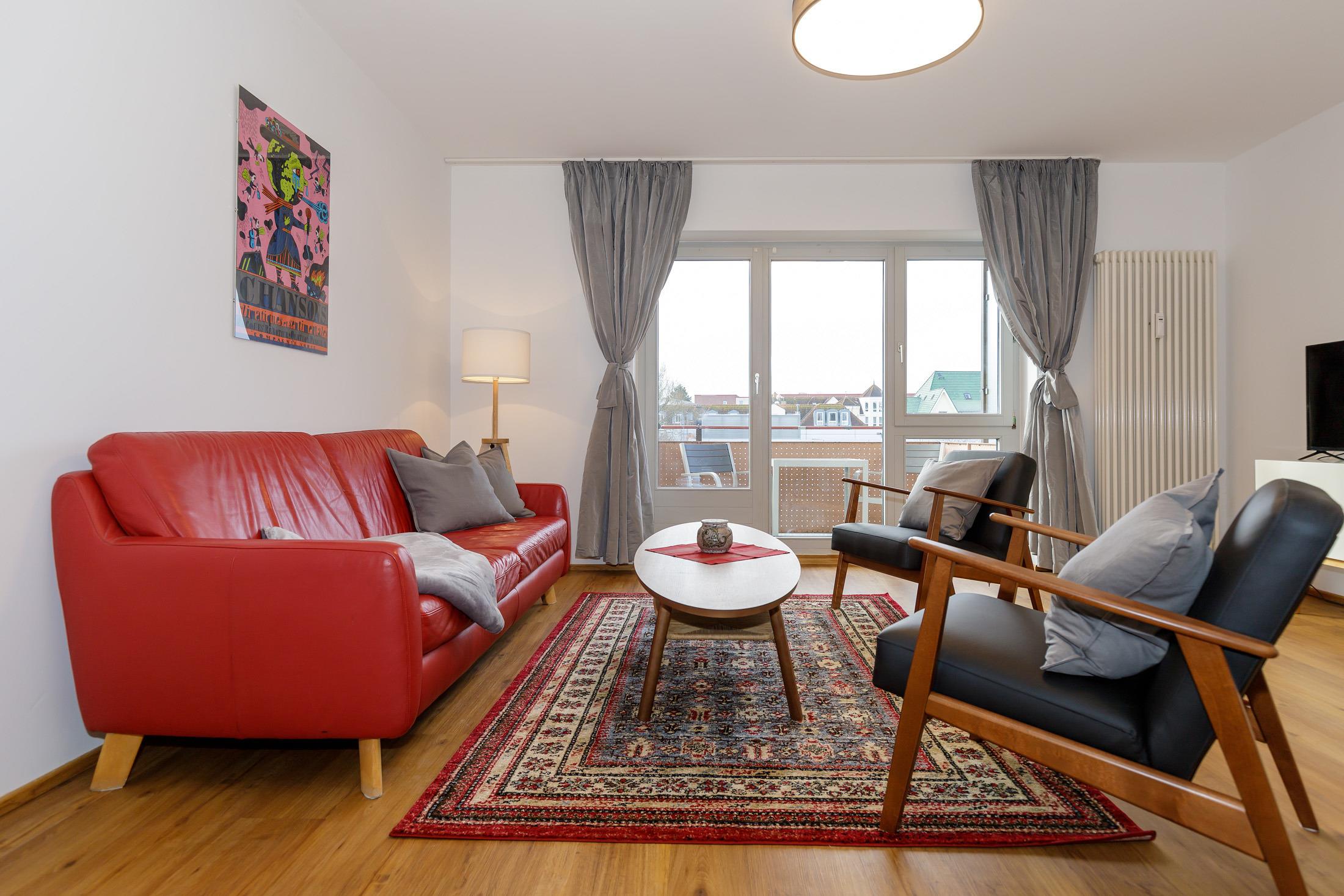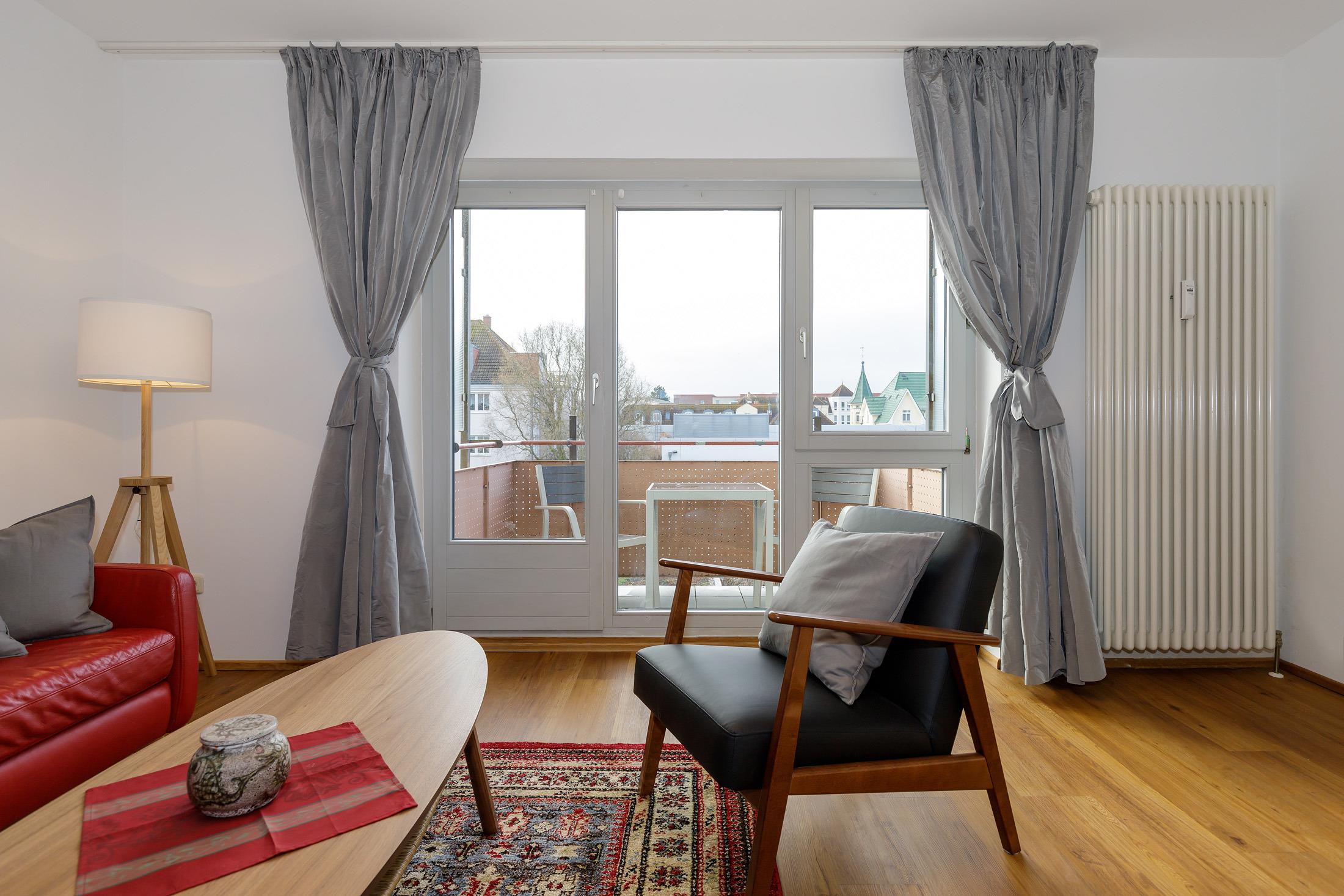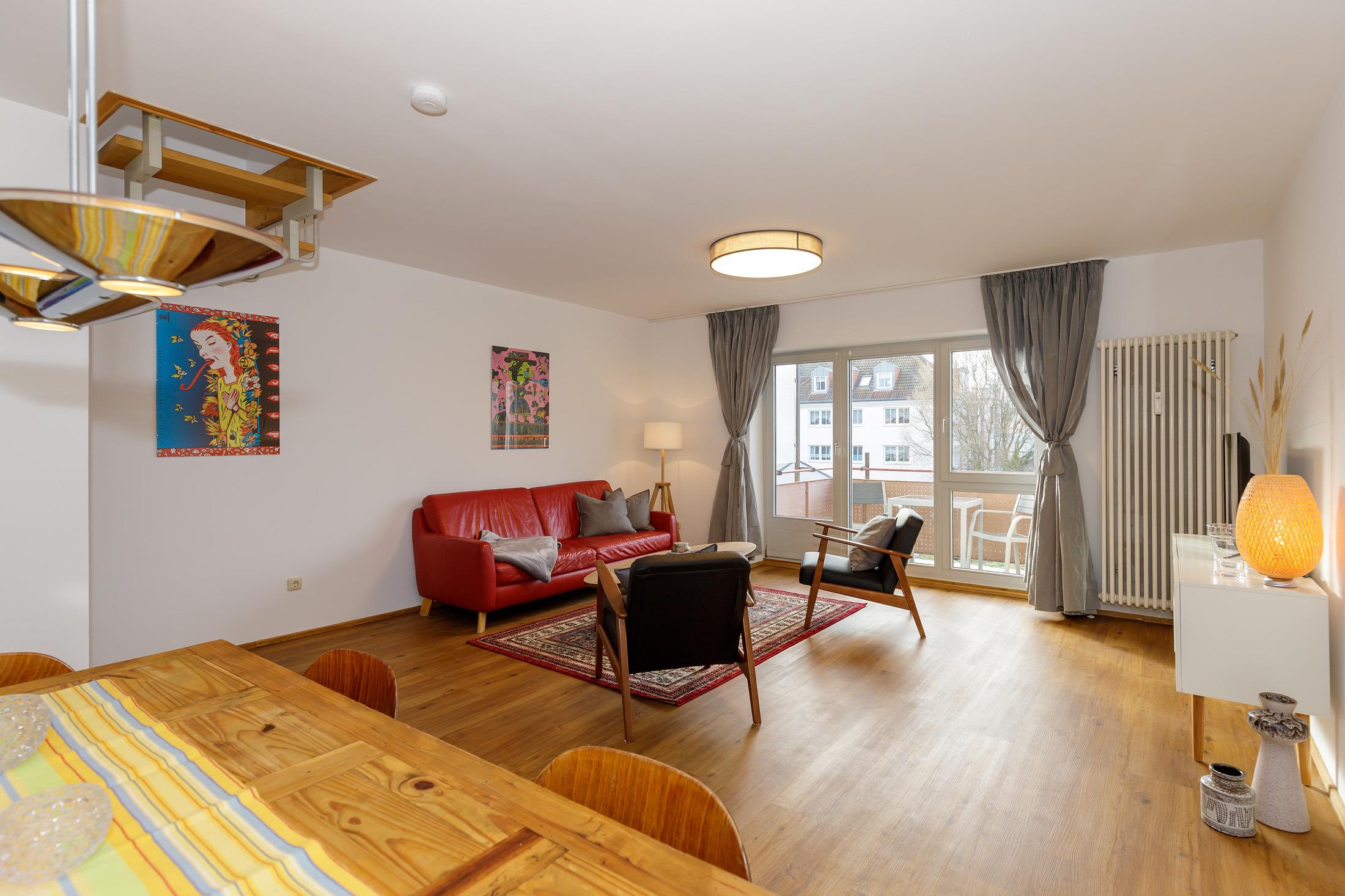 Vom Wohnzimmer aus gelangen Sie auf den sonnigen Südbalkon, auf dem Sie beispielsweise abends bei einem Glas Wein gute Gespräche oder aber auch ein Buch genießen können.
