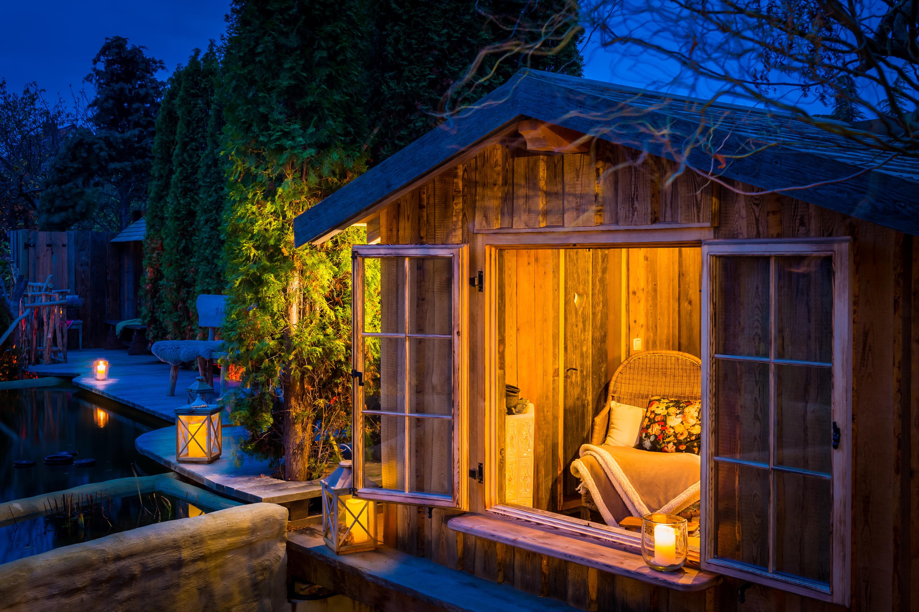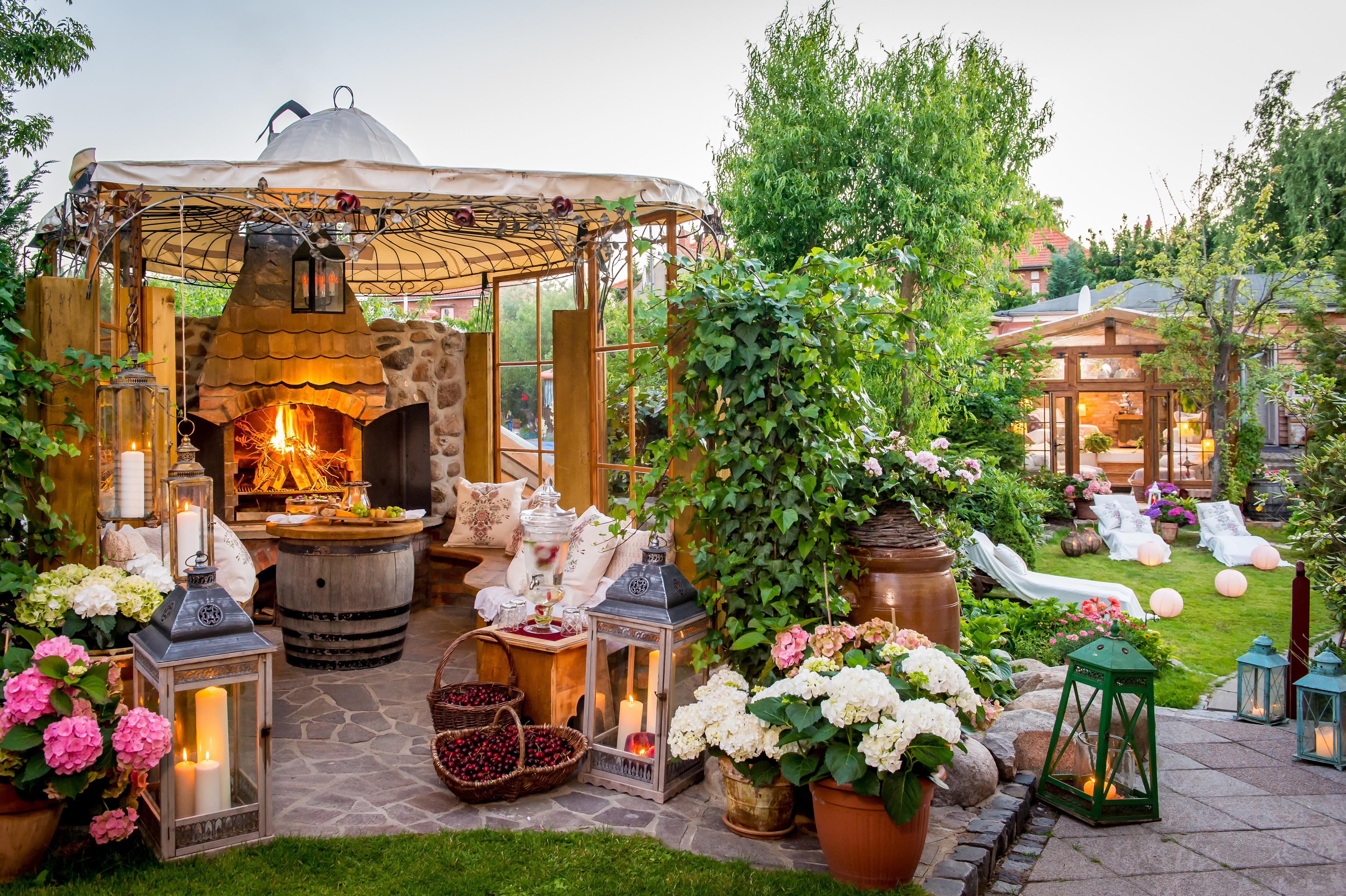 Eine Gartenküche mit nostalgischem Küchenherd (modernisiert mit Induktion) lädt zum Brutzeln und Kochen ein.