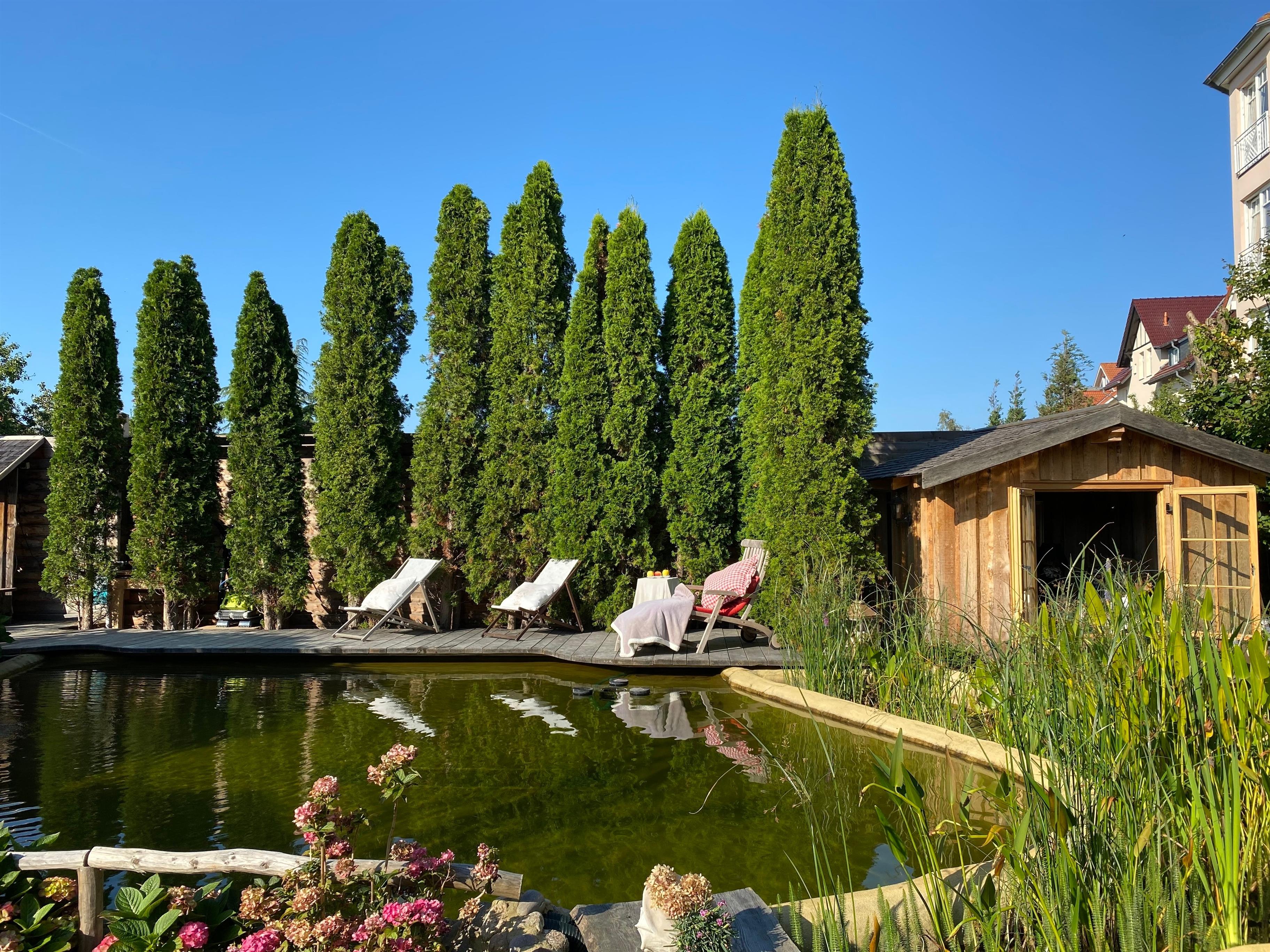 Ein besonders "Schmankerl" die sonnige Terrasse am plätschernden Bachlauf mit Blick über den Schwimmteich, welche zum Frühstück oder Abendessen im Garten einlädt.