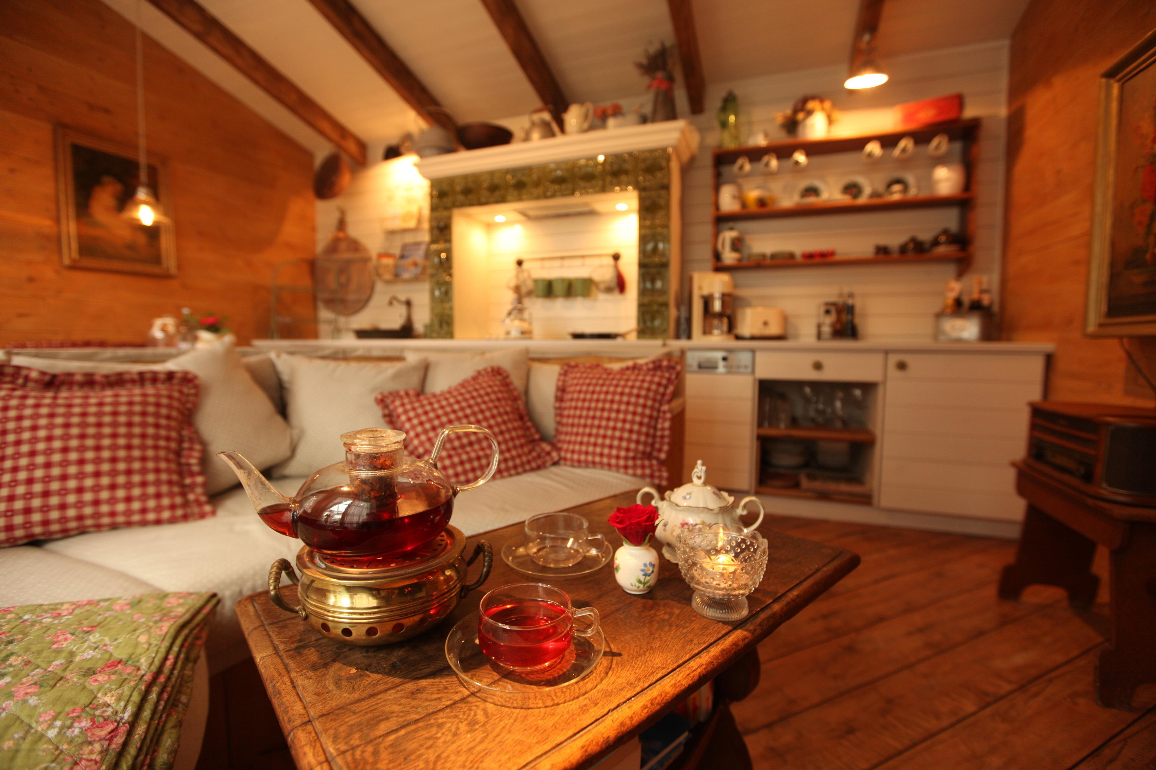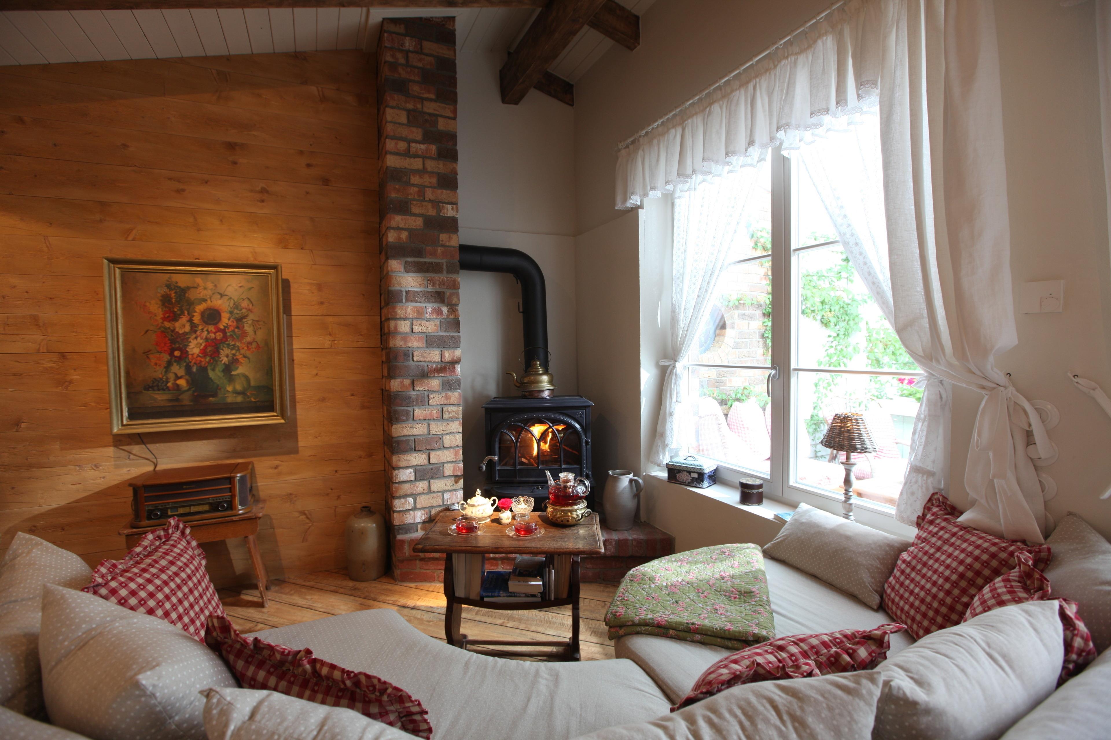 Das Innere der "Kräuterstube" ist Gemütlichkeit pur. Hier können Sie sich im Wohnbereich mit großem runden Kuschelsofa direkt vor dem knisterndem Holzofenkamin zurückziehen. (TV gehören auch hier zur Ausstattung)
