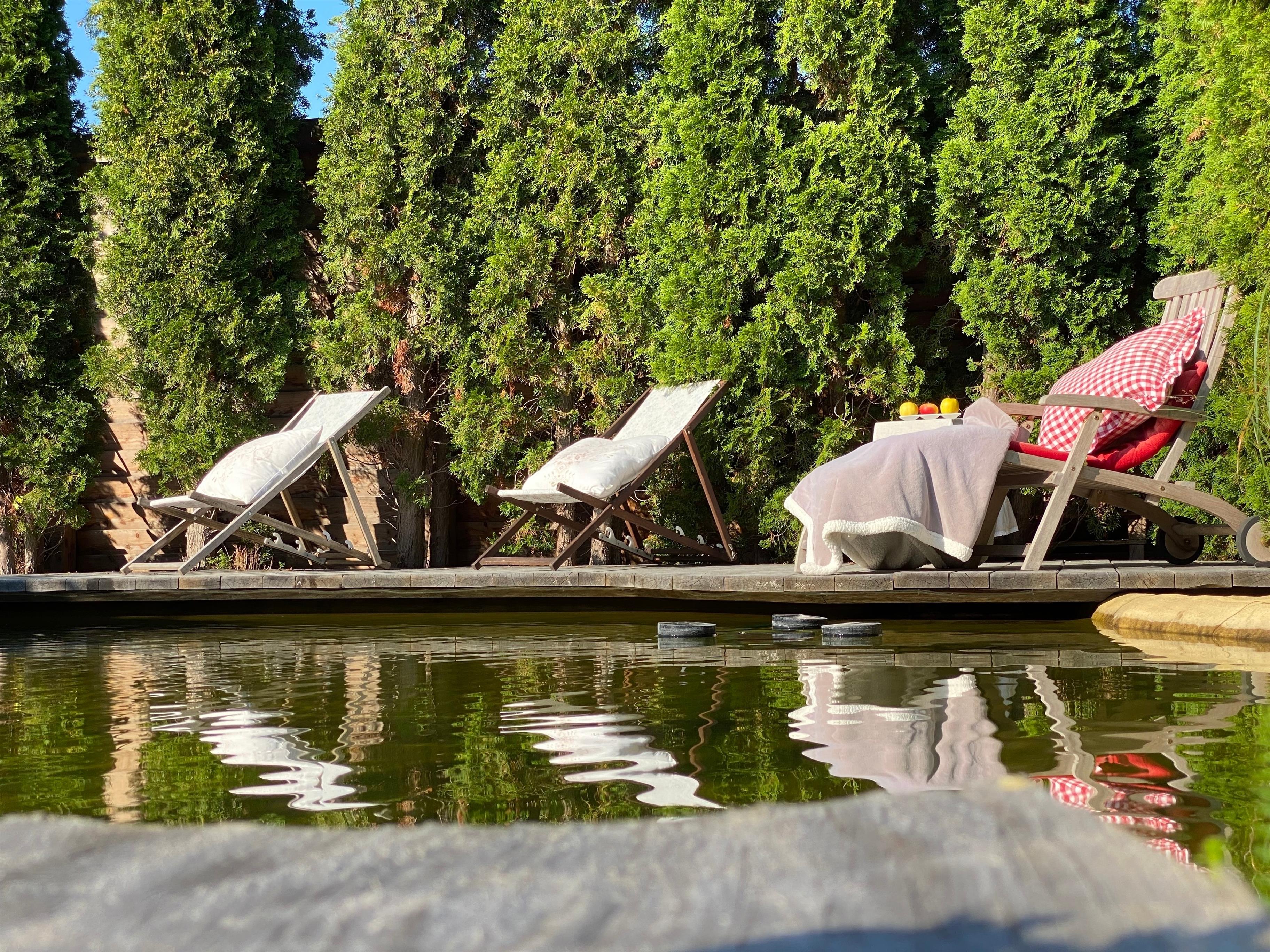 Gesamtgröße ca. 48qm, zuzüglich ca. 15qm sonniger überdachter Südterrasse, kostenfreies WLAN, Kamin & Fußbodenheizung, 1 PKW Stellplatz, Nutzung des Garten SPA mit Schwimmteich, Gartensaunen & Ruhebereichen