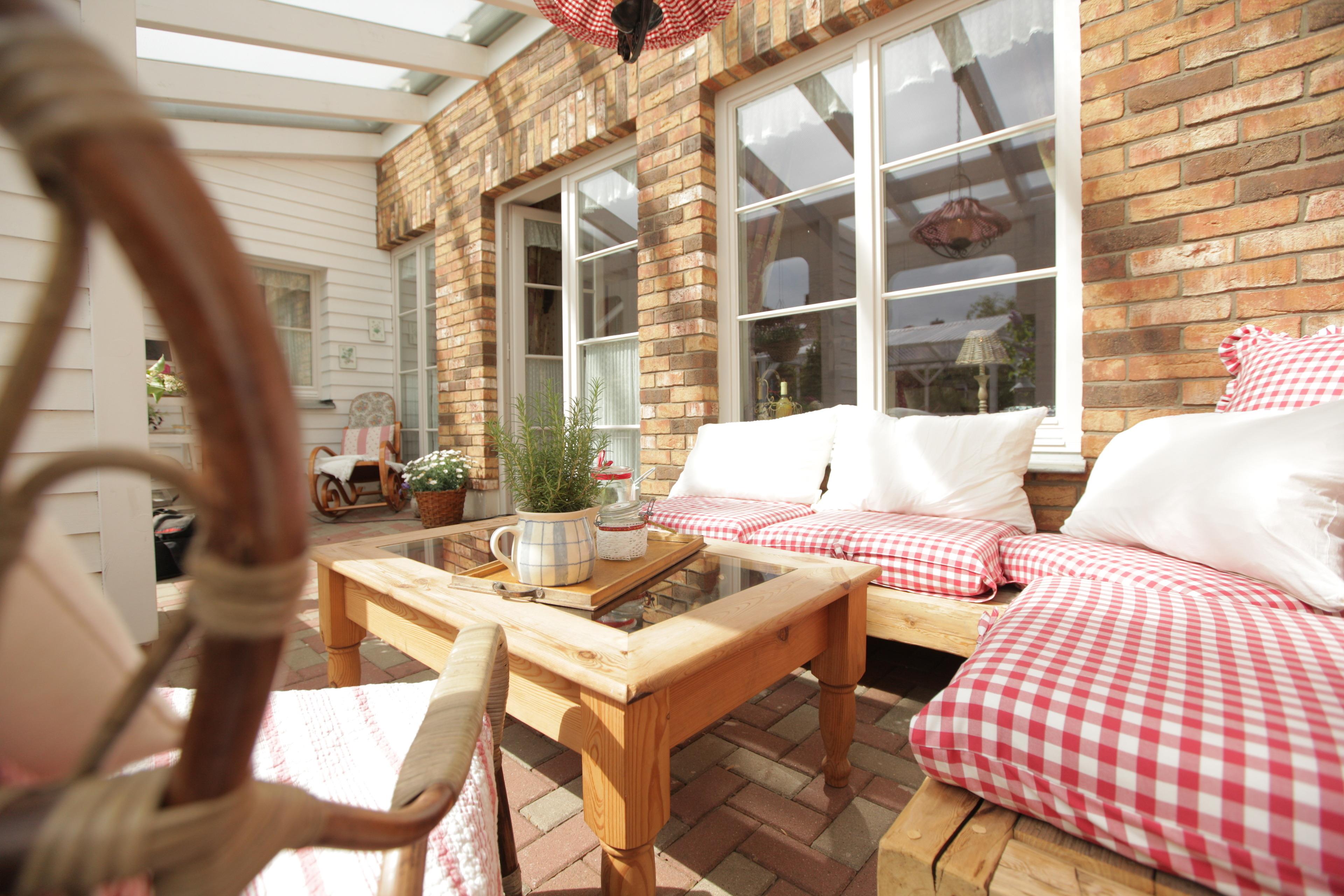 Verweilen Sie das ganze Jahr mitten im Garten auf der großen überdachten südlichen Gartenterrasse und versinken mit einem Buch im Sommer oder mit einem Glühwein im Winter in den weichen Kissen... lauschen den Zeichen der Jahreszeiten...