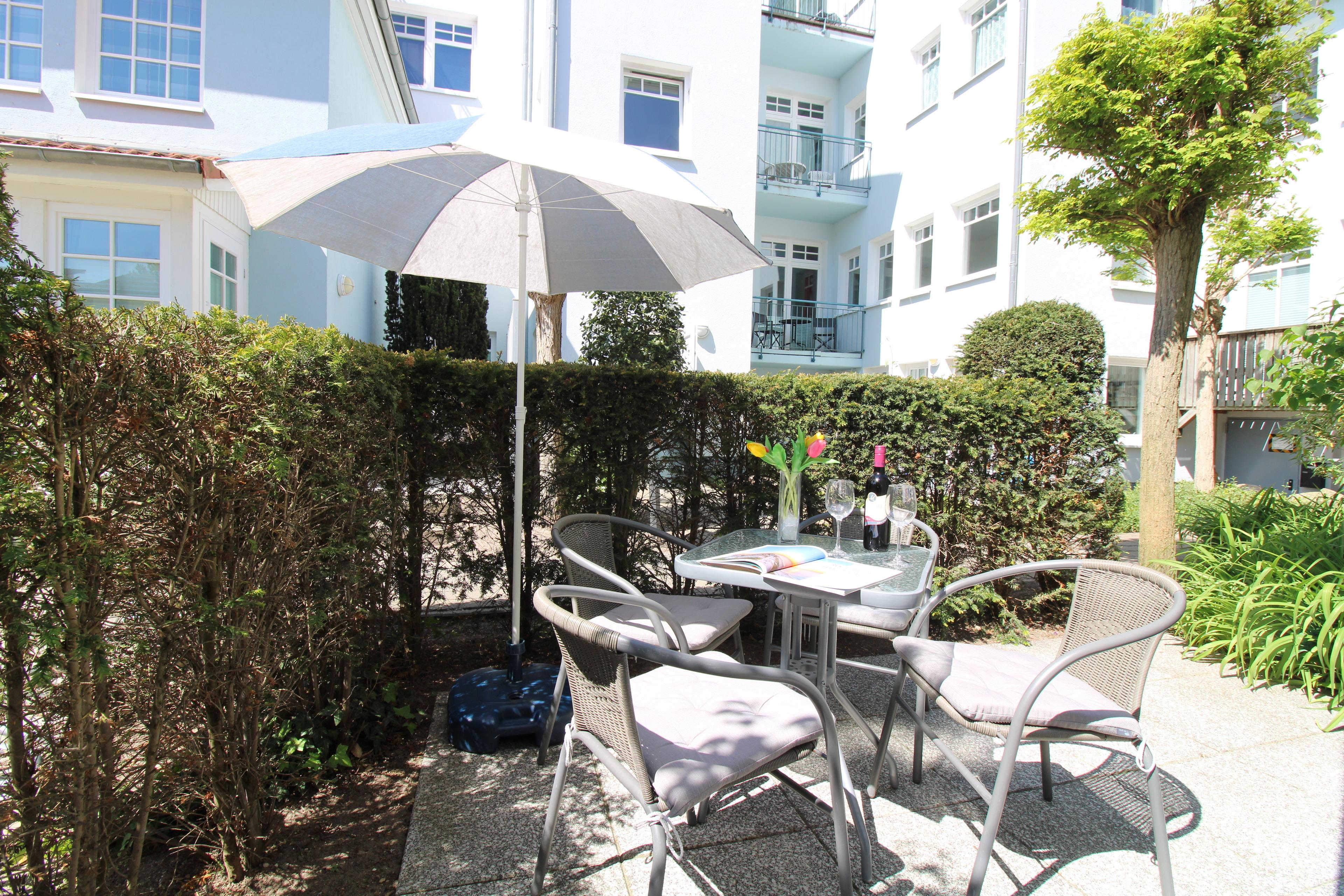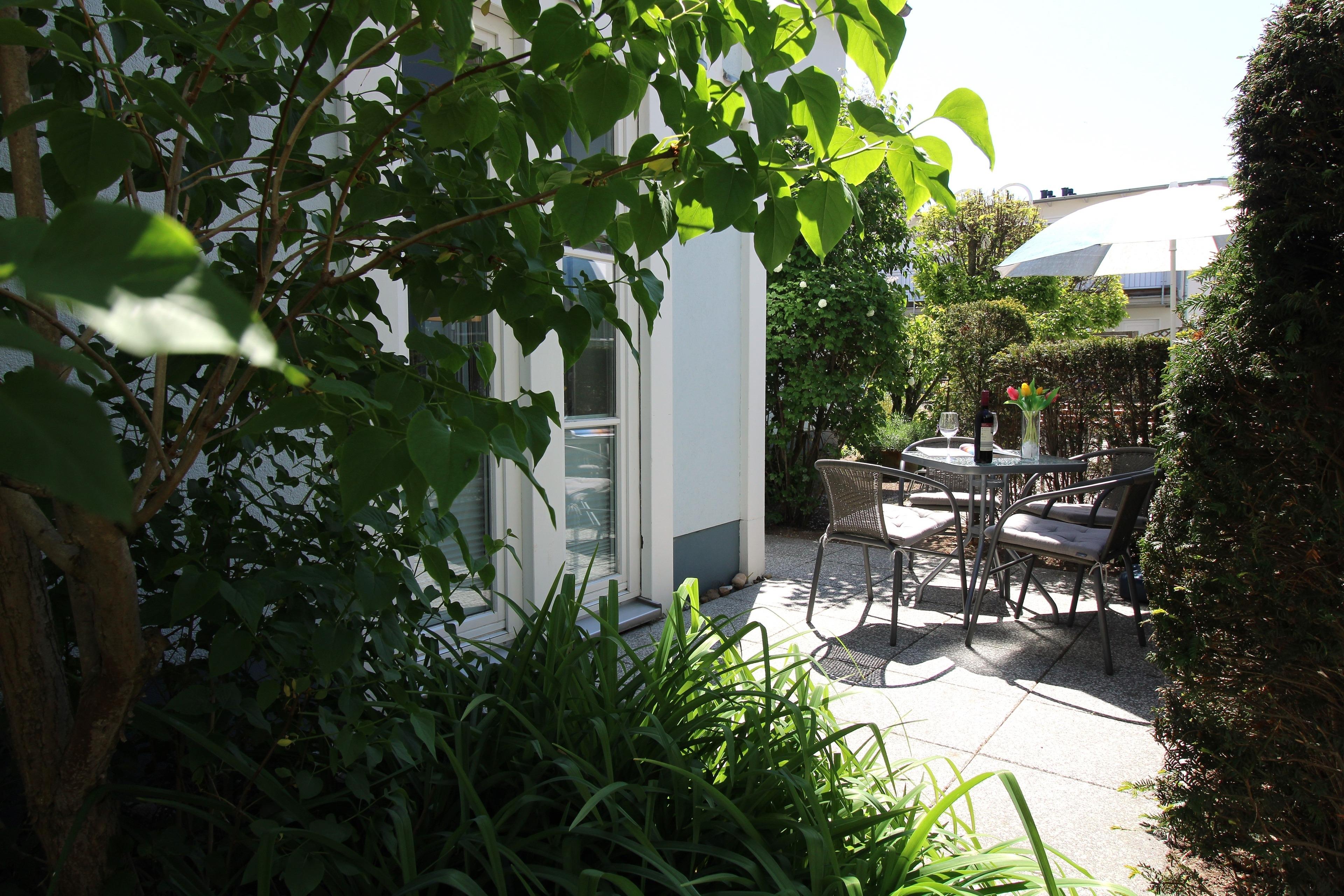 Das geräumige Wohn-/Esszimmer verfügt über eine separate Sitzgruppe mit bequemer (ausziehbarer Schlaf-)Couch, Sessel und Couchtisch, einen separaten Esstisch mit 4 Stühlen sowie einem Sideboard. Vom Wohnzimmer aus haben Sie direkten Zugang zu der ca. 8 m² großen Terrasse (nach Süd-Westen zum Innenhof ausgerichtet) mit Terrassenmöbeln. Hier sitzen Sie entspannt und gemütlich im Grünen und können abends bei einem guten Glas Wein in Ruhe die lauen Sommernächte genießen!