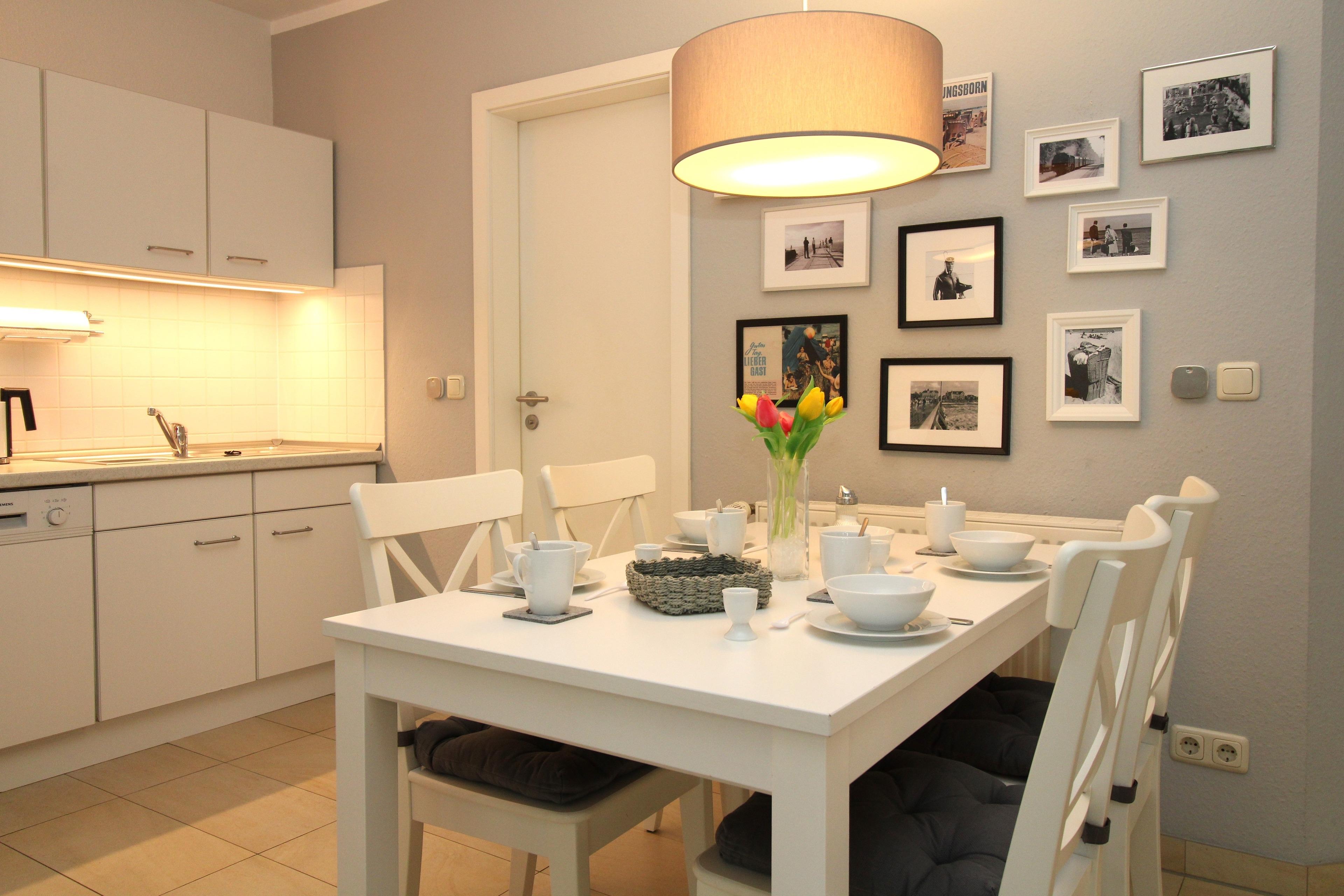 Die offene Küche beinhaltet eine voll ausgestattete Einbauküchenzeile mit 2-Zonen-Ceran-Kochfeld, Dunstabzug, mobilem Backofen, Mikrowelle, Kühlschrank mit Gefrierfach, Geschirrspülmaschine, 2 Kaffeemaschinen (1 x Nespresso-Kapsel-Maschine), Wasserkocher und Toaster. Die Küche ist mit Geschirr, Gläsern, Besteck und Töpfen komplett ausgestattet.