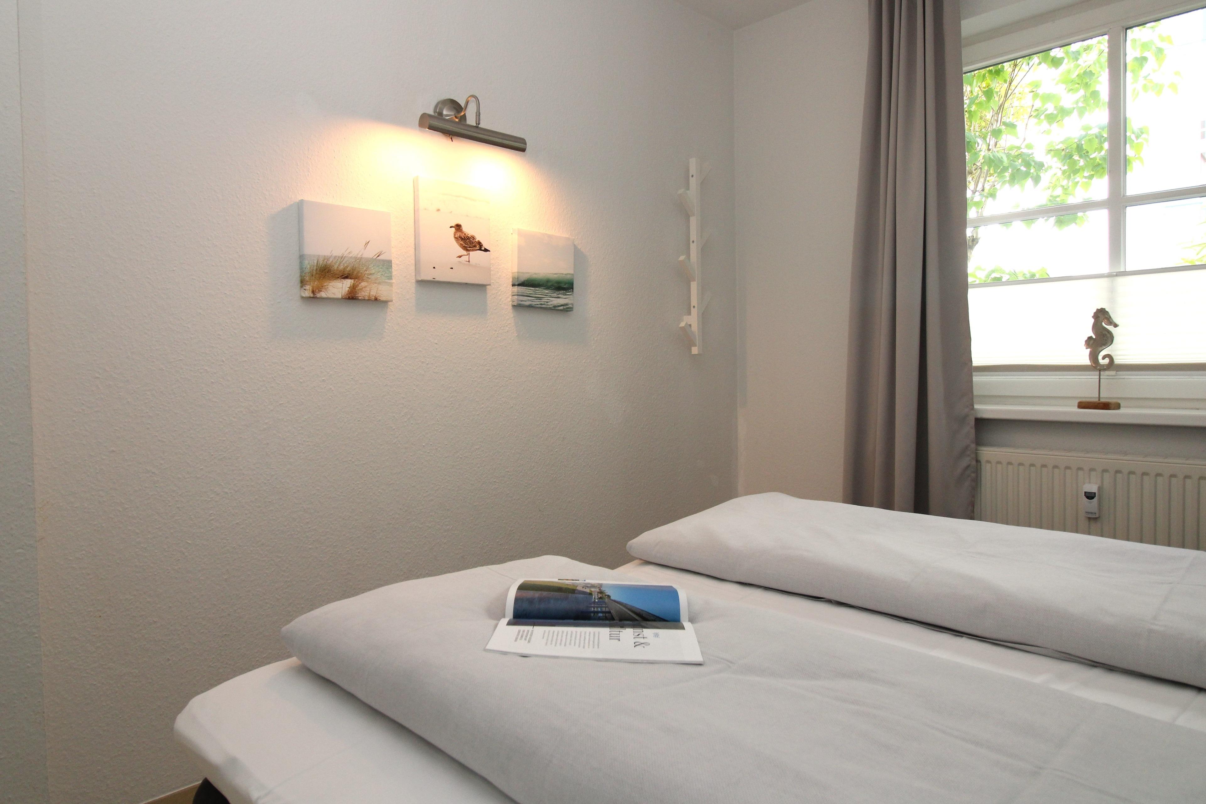 Das moderne und freundliche Schlafzimmer ist mit einem bequemen Boxspring-Doppelbett (2 x 80 cm x 200 cm), Nachttischen mit Nachttischlampen, einem geräumigen Kleiderschrank sowie 2 Wandgarderoben eingerichtet.
