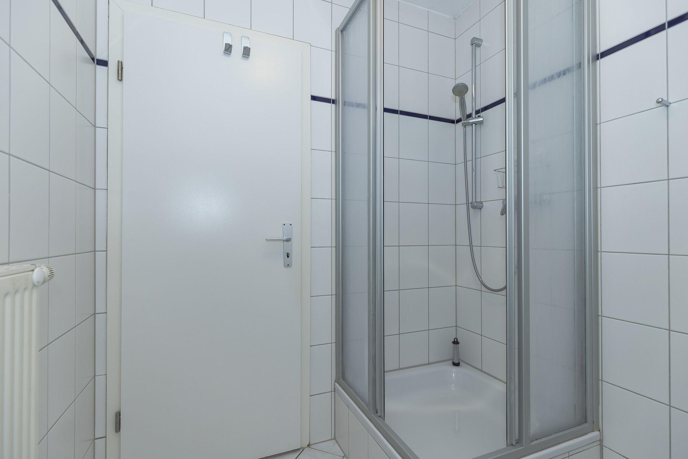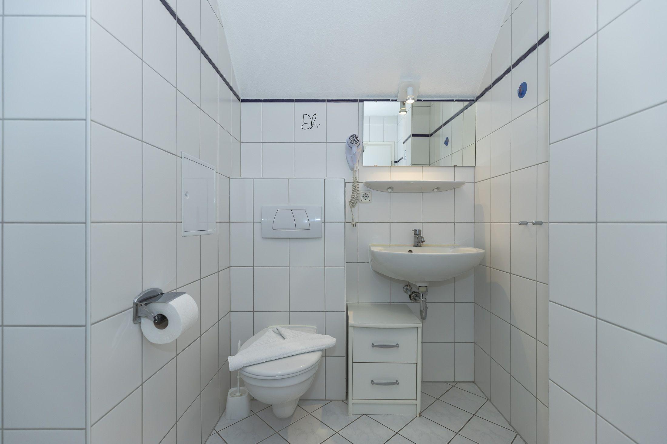 Das Badezimmer verfügt über eine Dusche, ein kleines Waschbecken mit Spiegel, ein WC und genügend Ablagefläche für Ihre Kosmetika.
