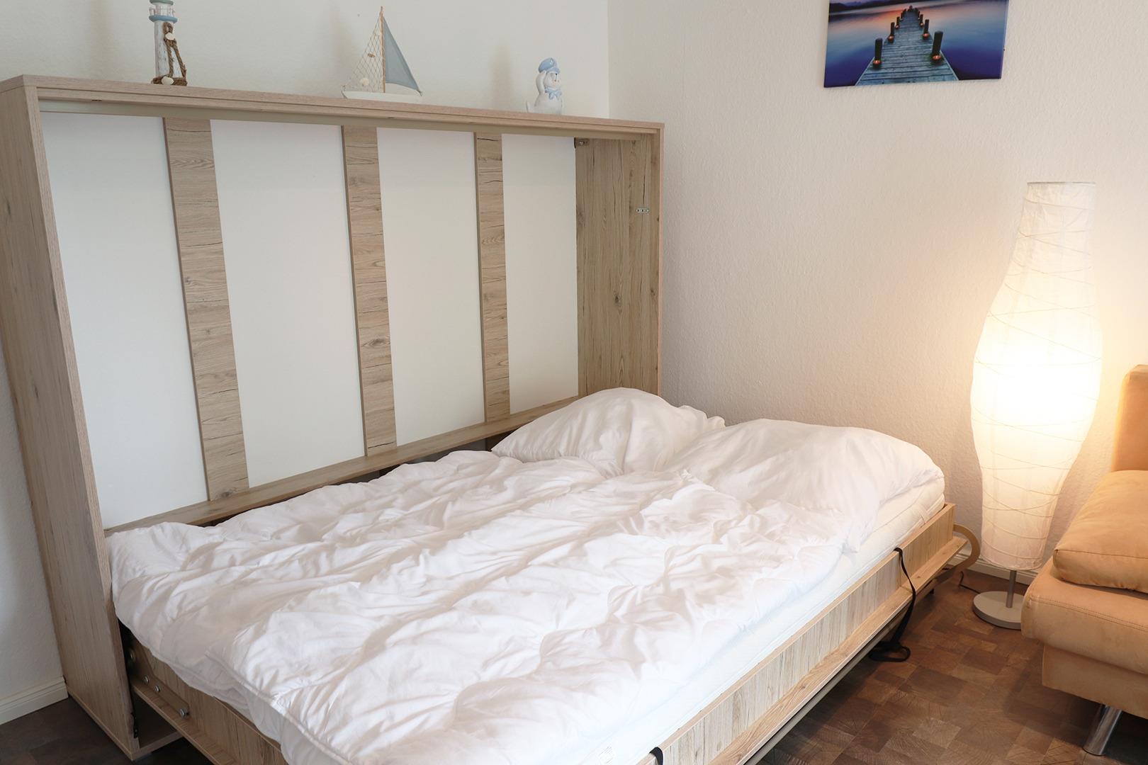 Im Wohnbereich befindet sich eine Sitzgruppe mit Flachbild-TV sowie das sehr bequeme Schrankbett, welches Ihnen tagsüber viel Freiraum im Appartement bieten und für die Nacht schnell auszuklappen ist.