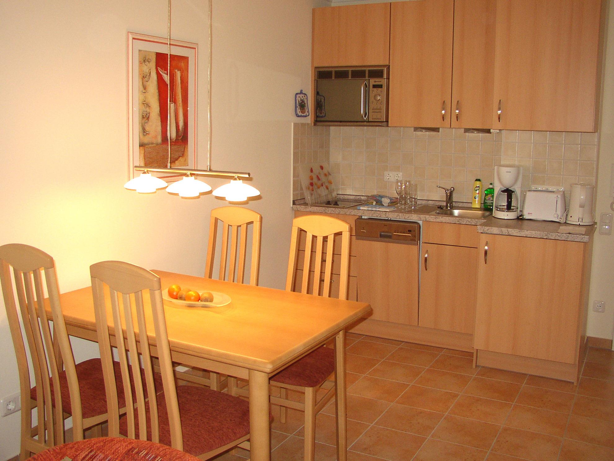 Die vollständige Kücheneinrichtung mit Ceran-Kochfeld, Dunstabzugshaube, Mikrowelle mit Crisp-Funktion, Geschirrspüler und Kühlschrank hilft Ihnen, sich wie zu Hause zu fühlen.