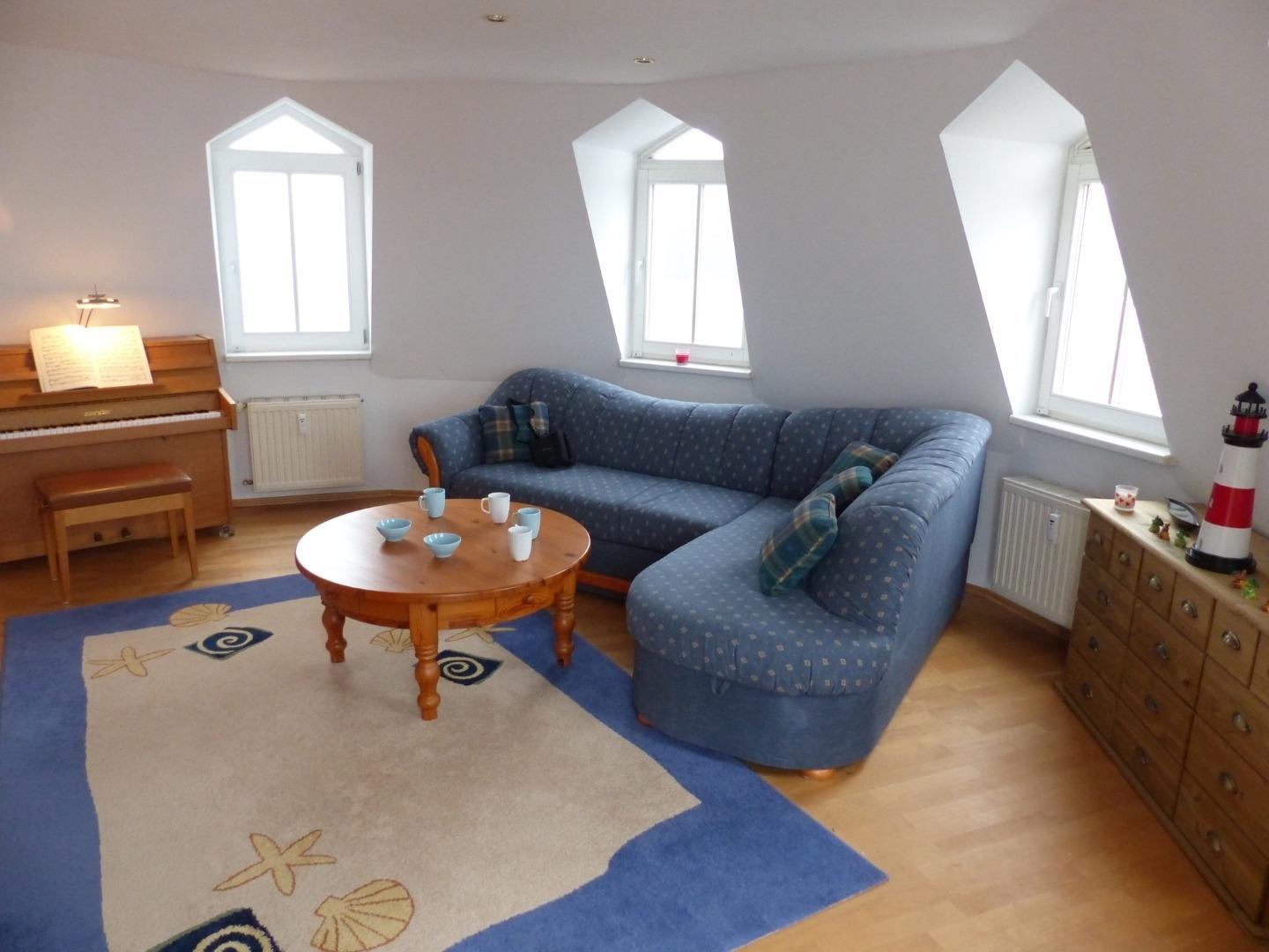 Nach oben erreicht man ein zweites Wohn-/Schlafzimmer mit einem ausziehbaren Schlafsofa und einem Klavier.