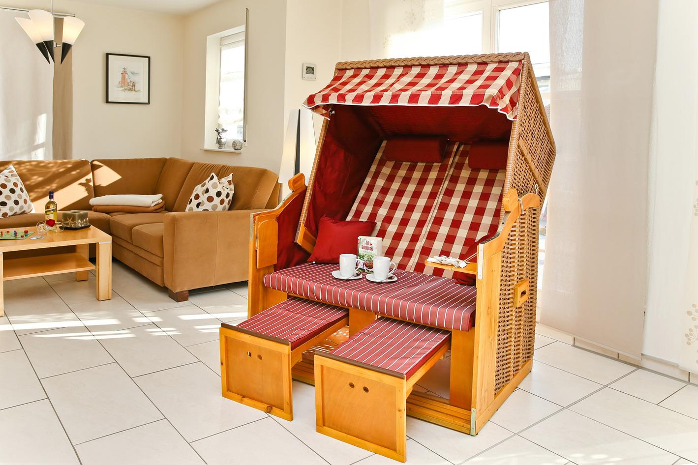 Der großzügige Wohnbereich ist eingerichtet mit einer Sitzgruppe und moderner Hifi-Anlage und Flachbild-TV (SAT-Schüssel).