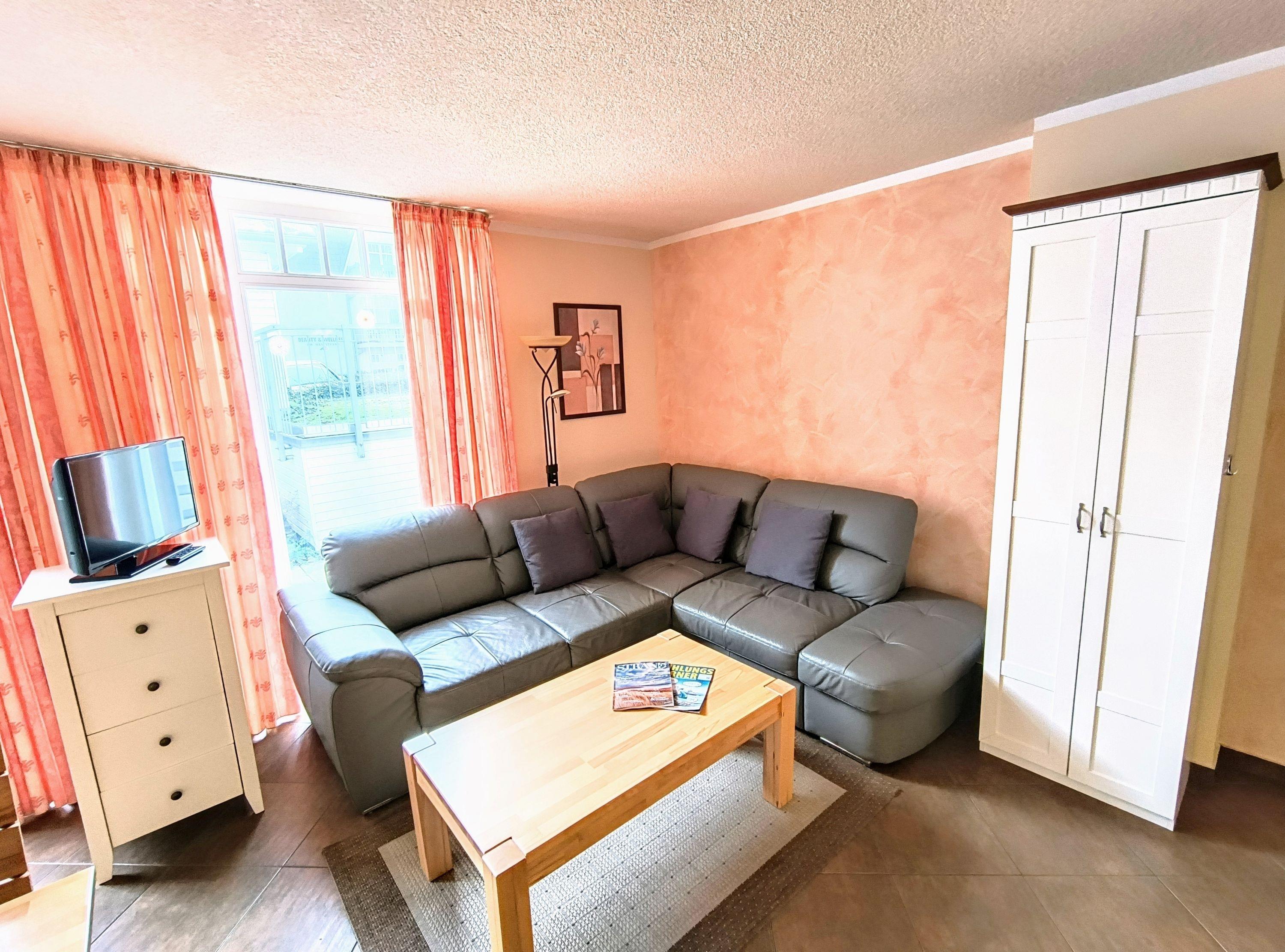 Der Wohnbereich ist eingerichtet mit einer Ecksitzgruppe mit Schlaffunktion und einer modernen Einbauküche mit Geschirrspüler, Mikrowelle und 4-Platten-Herd mit Backofen.