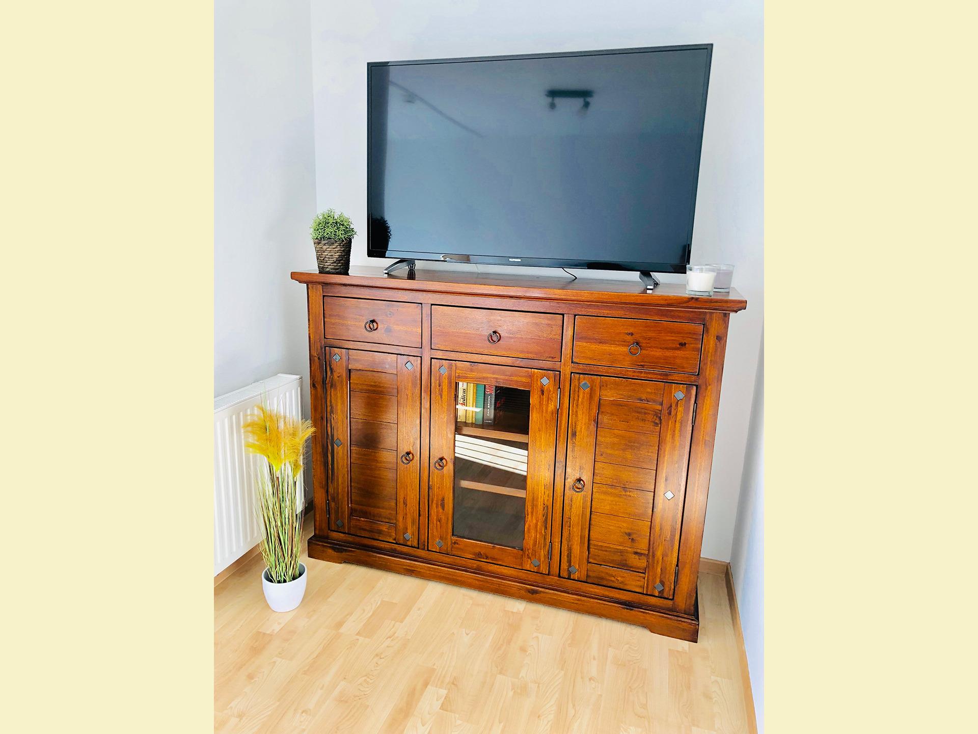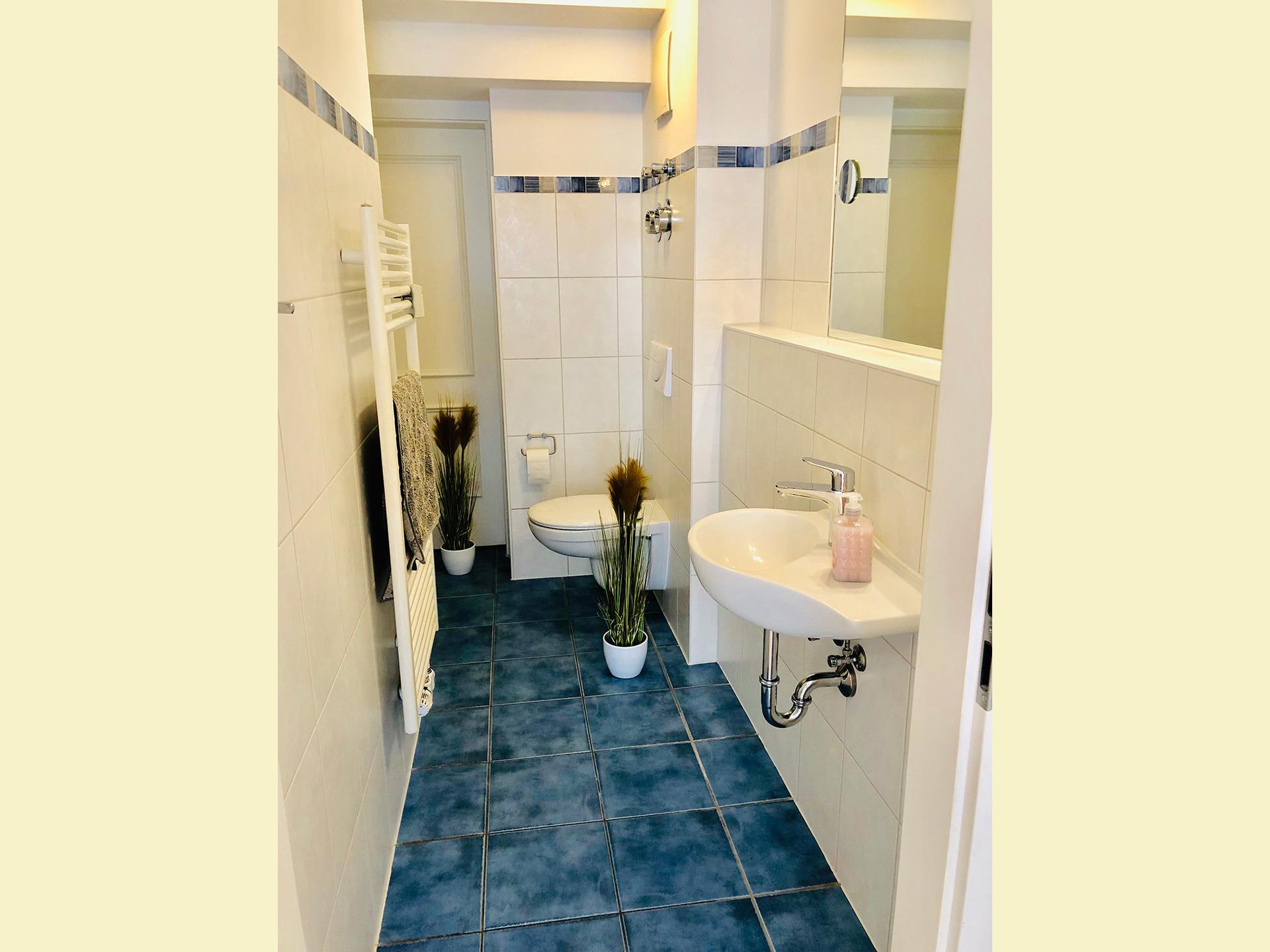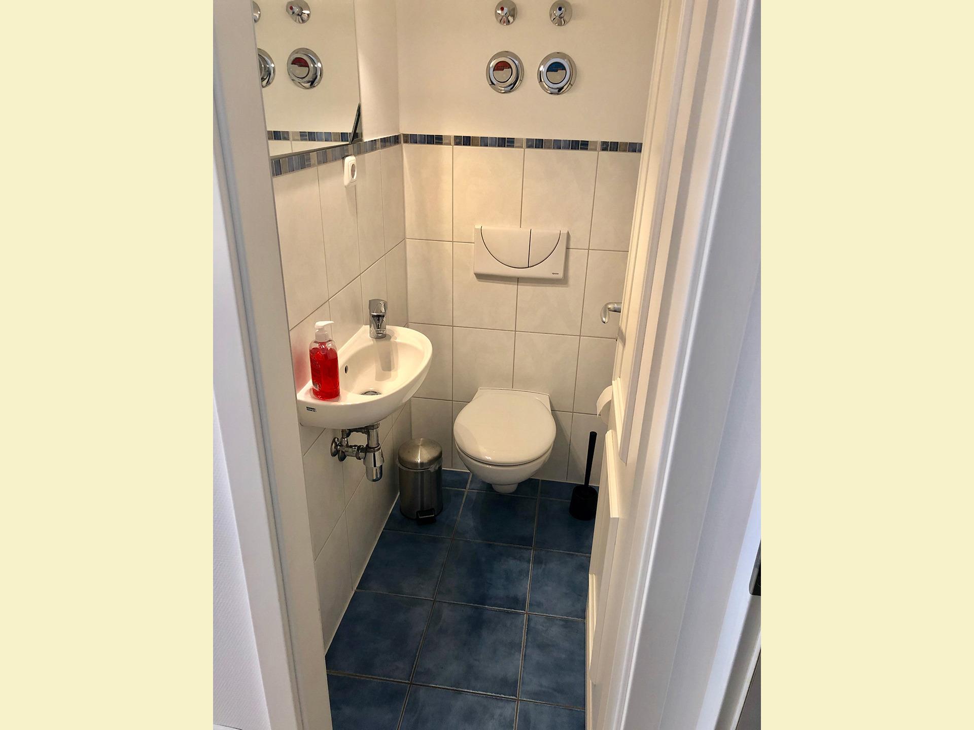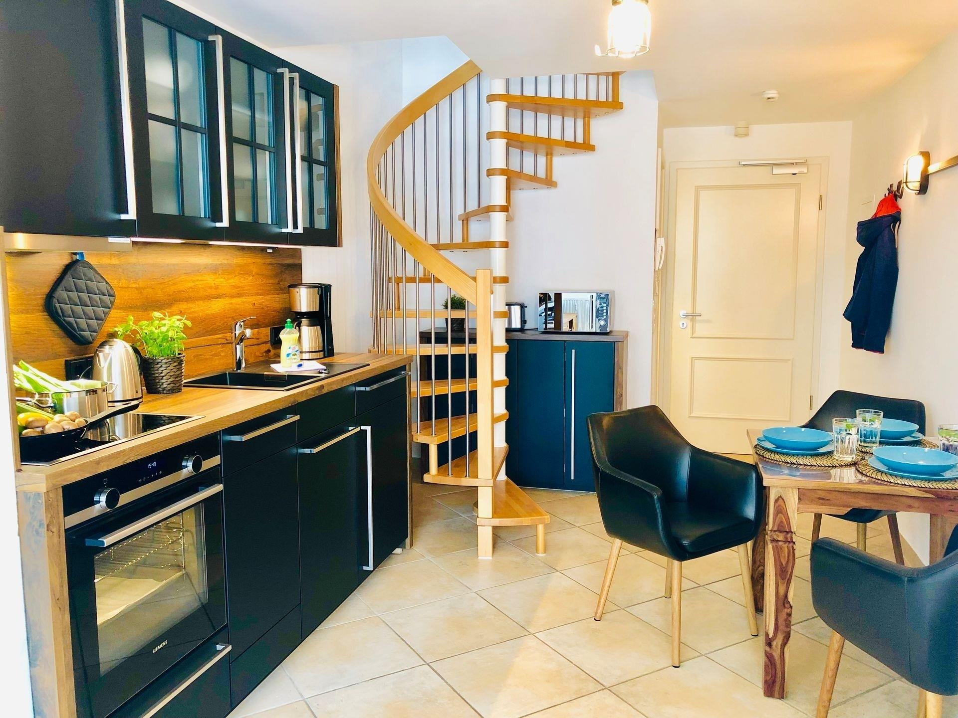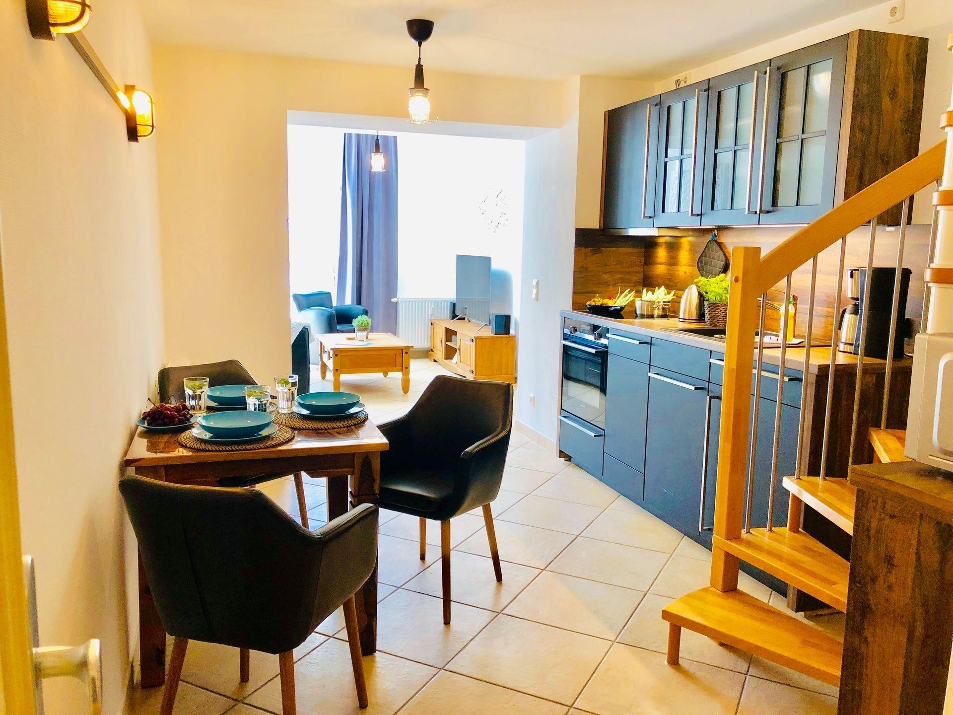 Die Ferienwohnung verfügt über einen großzügigen Wohnbereich im Erdgeschoss. Hier befindet sich eine geräumige Wohnküche, ausgestattet mit einem 4-Platten-Induktionsherd, Backofen, Mikrowelle, Geschirrspüler und einer Tchibo cafissimo Kapselmaschine. Auch ein modern eingerichtetes Wohnzimmer mit Sitzgruppe, Lederschlafcouch mit Expressfunktion und echter Matratze sowie ein Gäste-WC sind hier zu finden. Technische Highlights sind eine Musikanlage mit CD-Player, ein QLED 55 Zoll TV und Zugang zu DAZN und Netflix (inklusive komplettem HD-Paket für private Sender). Es stehen auch einige Bücher, Karten- und Brettspiele zur Verfügung. Der Fußboden ist gefliest und es gibt eine Terrasse zur Südseite des Hauses.