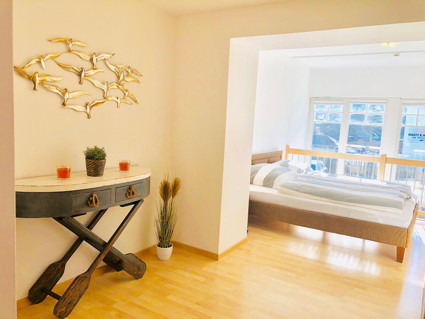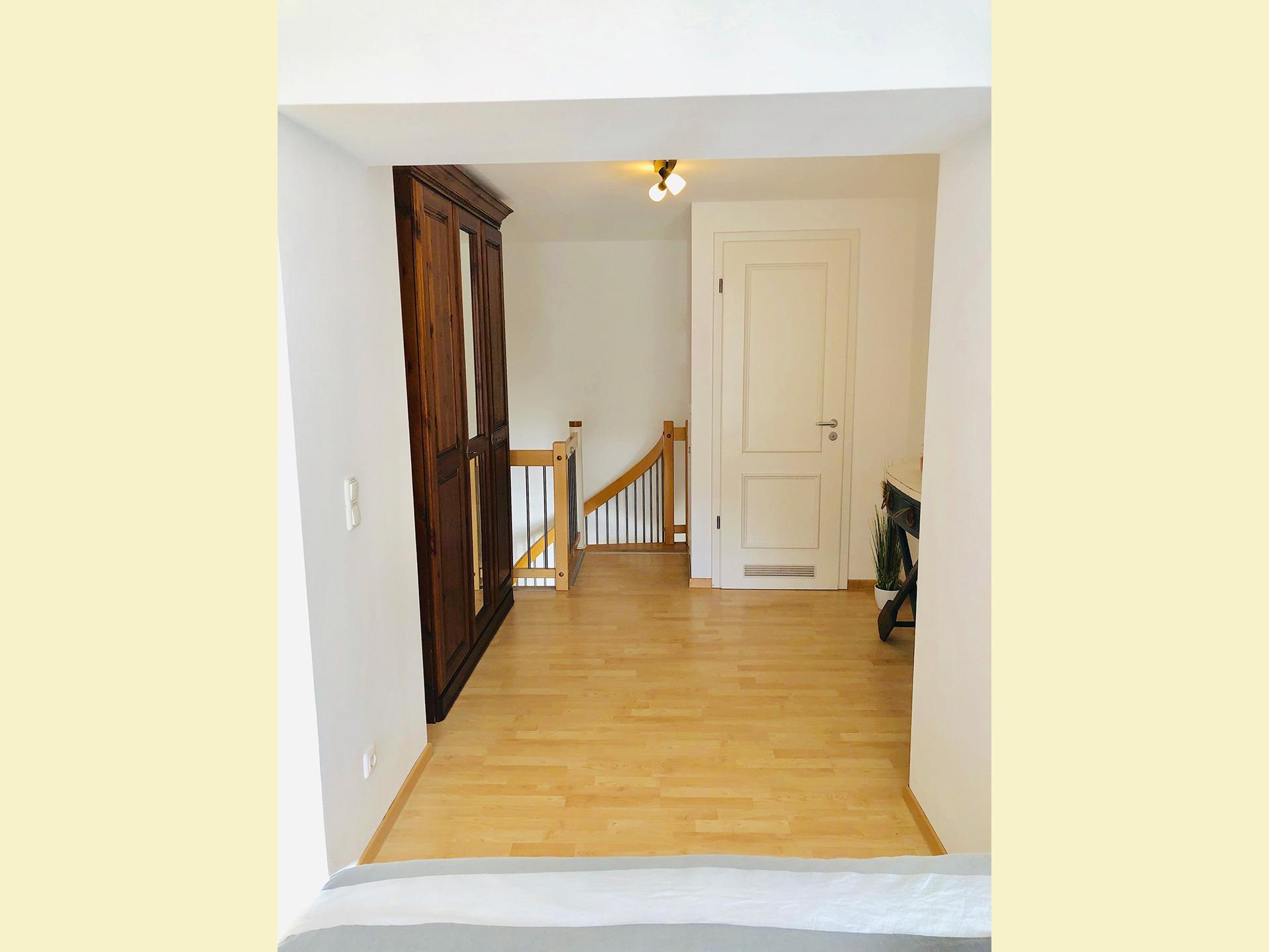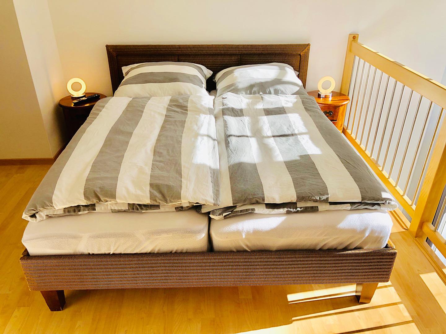 Über eine Wendeltreppe gelangt man in die offene Galerie, die mit einem Schlafzimmer mit Doppelbett und einem 55 Zoll TV ausgestattet ist. Der Boden ist hier mit Laminat verlegt. Ein Duschbad/WC komplettiert die Ferienwohnung im oberen Bereich. Die Wohnung ist rauchfrei und Haustiere sind nicht erlaubt.