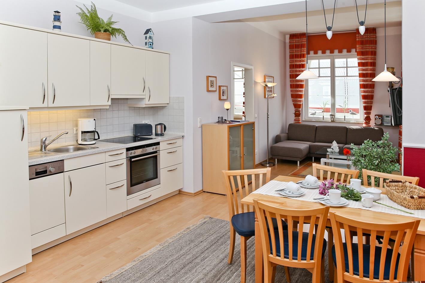 Der Wohnbereich besteht aus einer Sitzgruppe (nicht zum schlafen ausziehbar) mit Farb-TV und Hifi-Anlage. Die moderne Küche mit Geschirrspüler, Mikrowelle, Backofen und 4-Platten-Herd ist im Wohnbereich integriert.