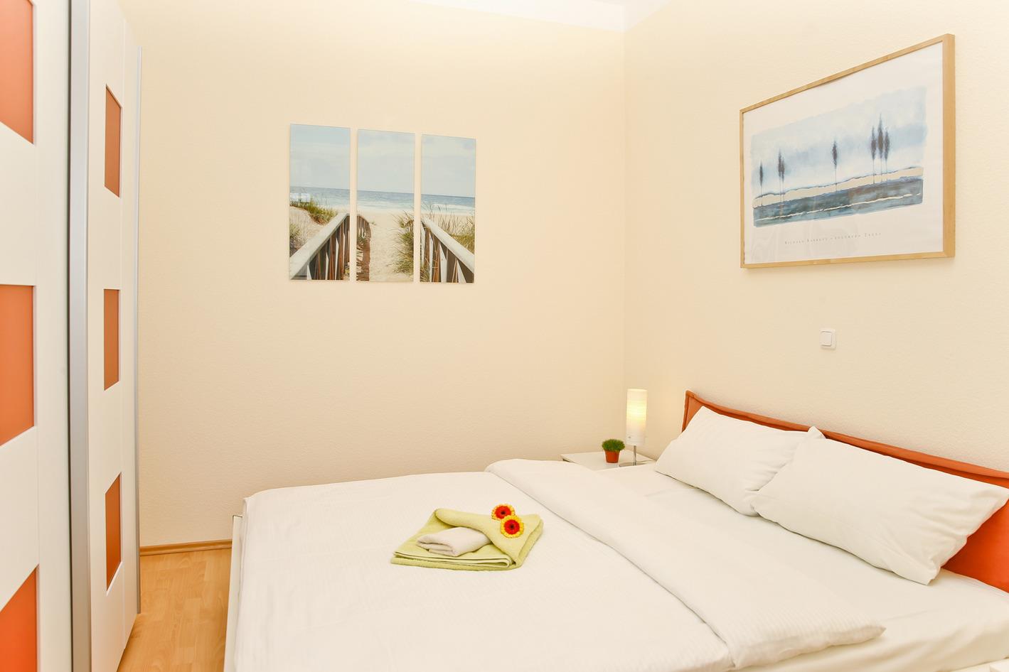 Die Schlafmöglichkeiten bestehen aus einem Schlafzimmer mit Doppelbett sowie einem zweiten Schlafzimmer mit Etagenbett mit unten integriertem Rollbett.