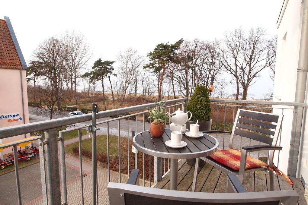 Der Fußboden ist mit Fliesen verlegt. Vom Westbalkon kann man teilweise die Ostsee sehen.