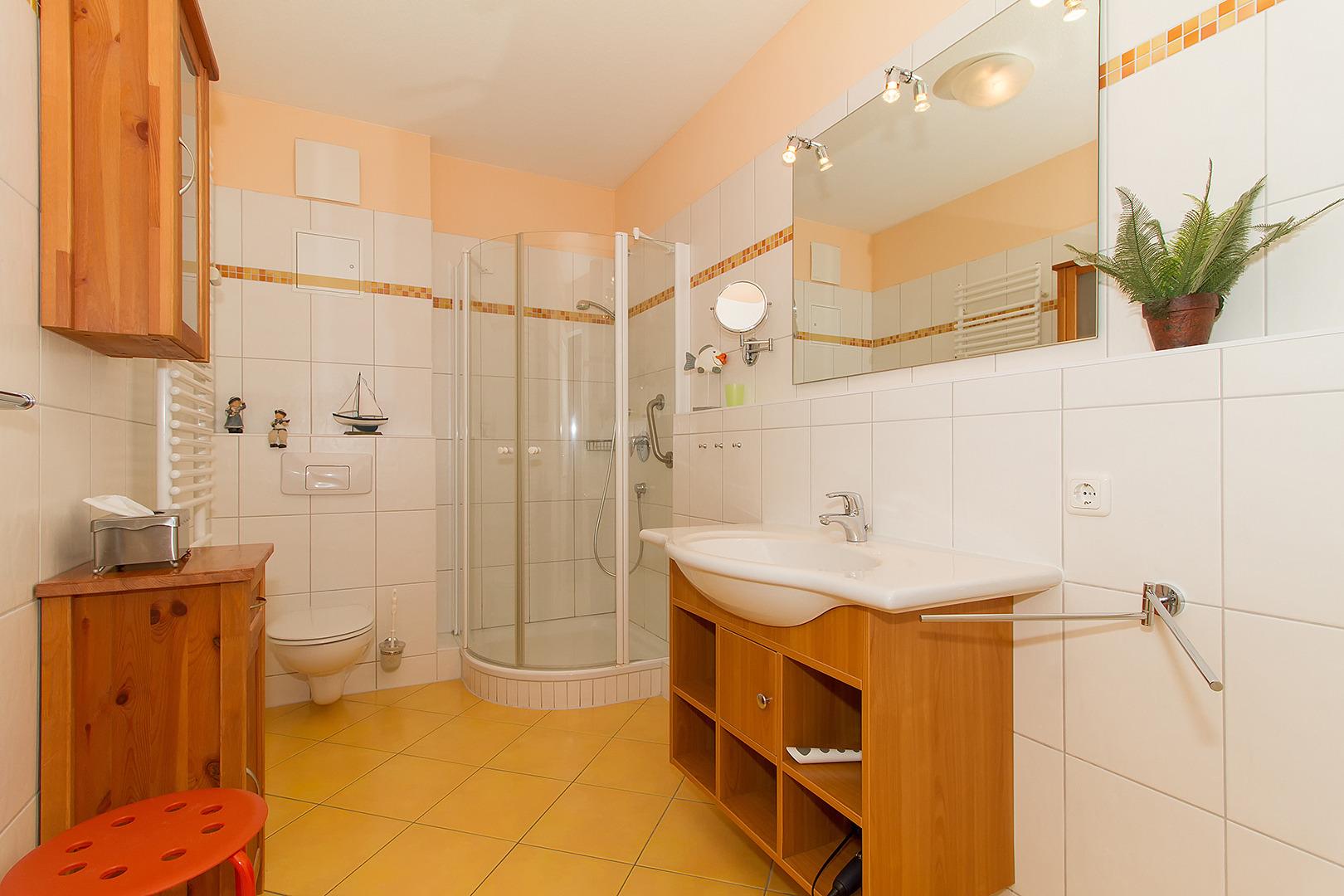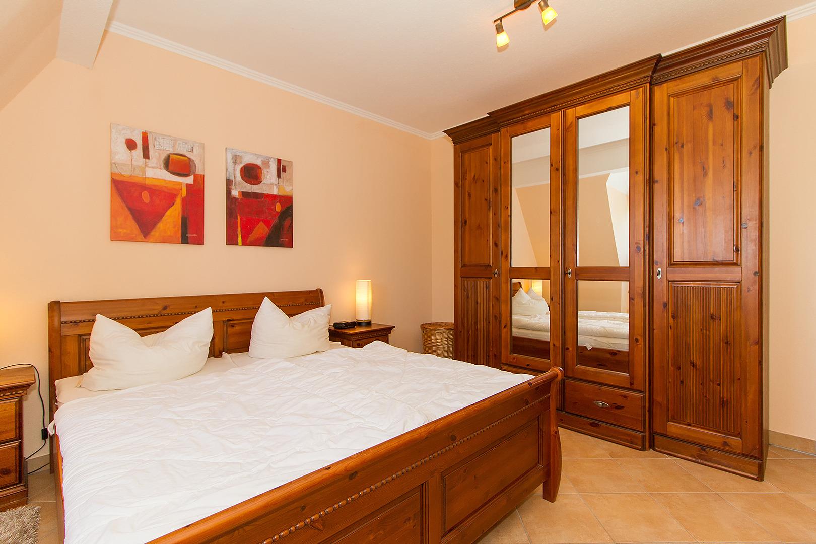 Im Schlafzimmer befindet sich ein Doppelbett. Das Duschbad/WC mit Fußbodenheizung ergänzt die Ferienwohnung.