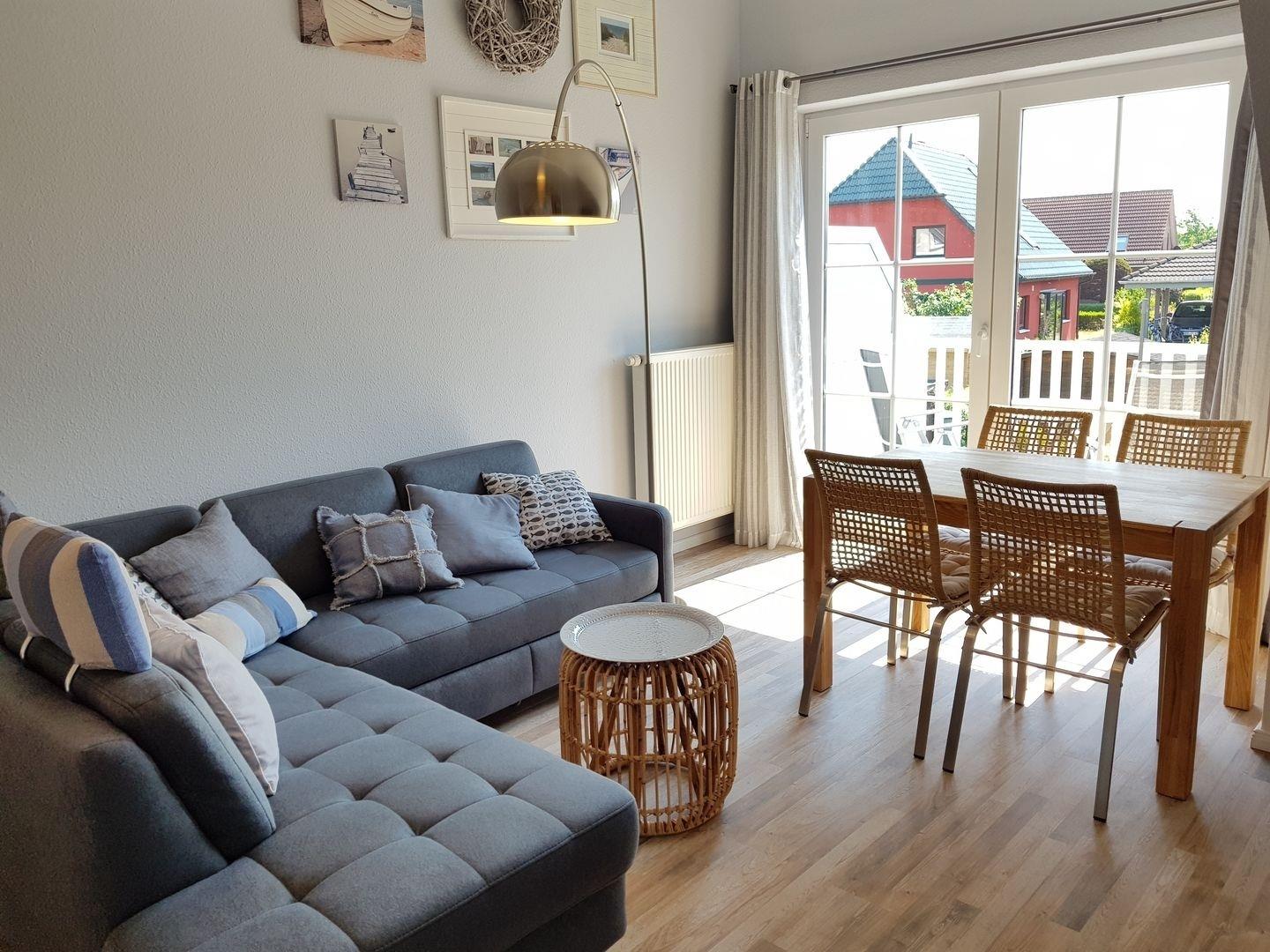 Im Wohnzimmer befindet sich ein bequemes Ecksofa um sich von Ihren Ausflüge in Kühlungsborn und Umgebung zu erholen. Sie finden hier einen Flachbildfernseher vor. Der Essbereich ist im Wohnzimmer integriert.