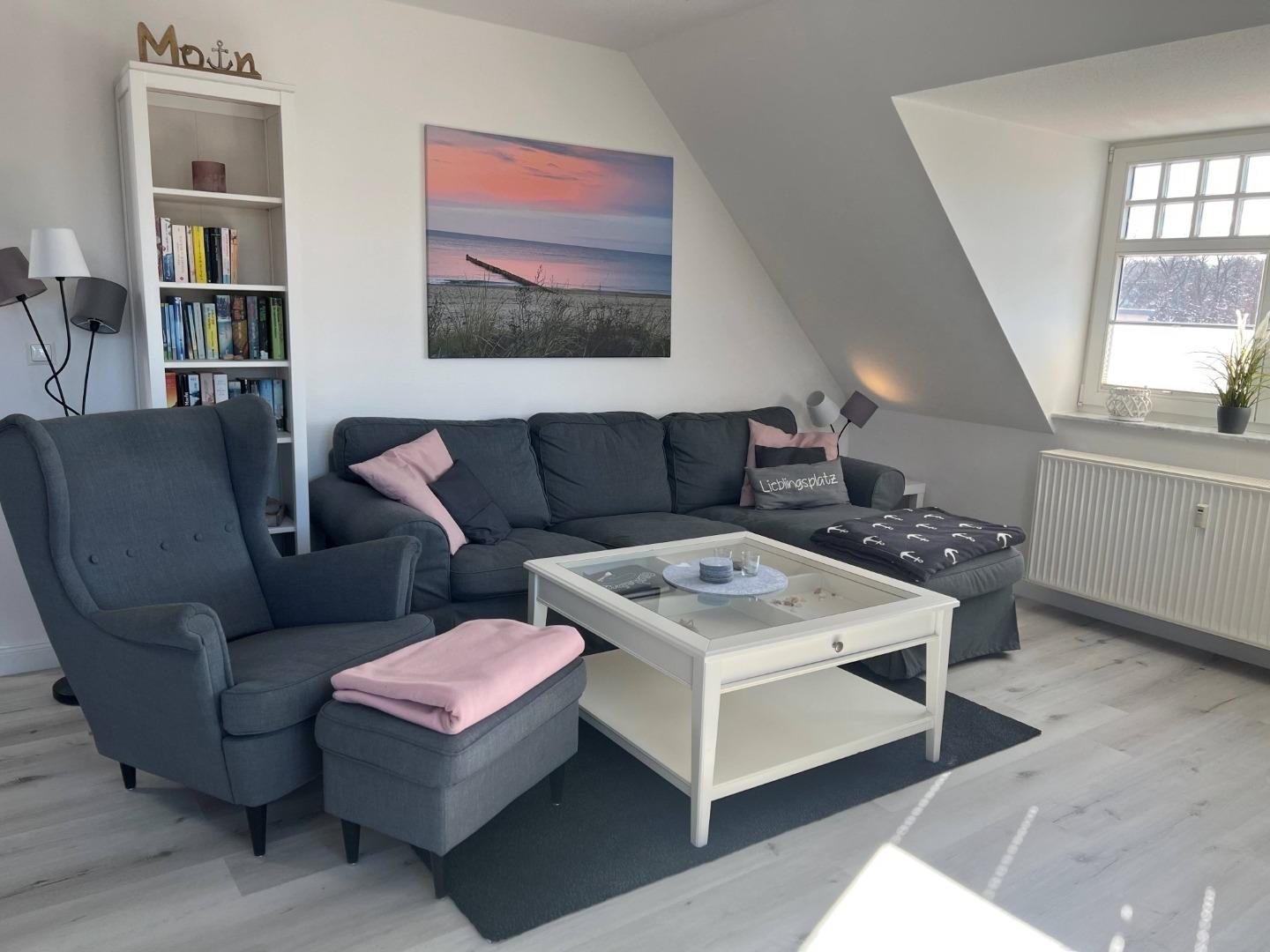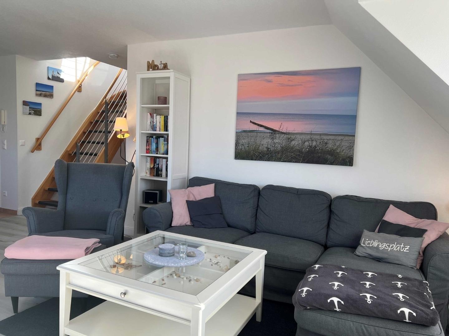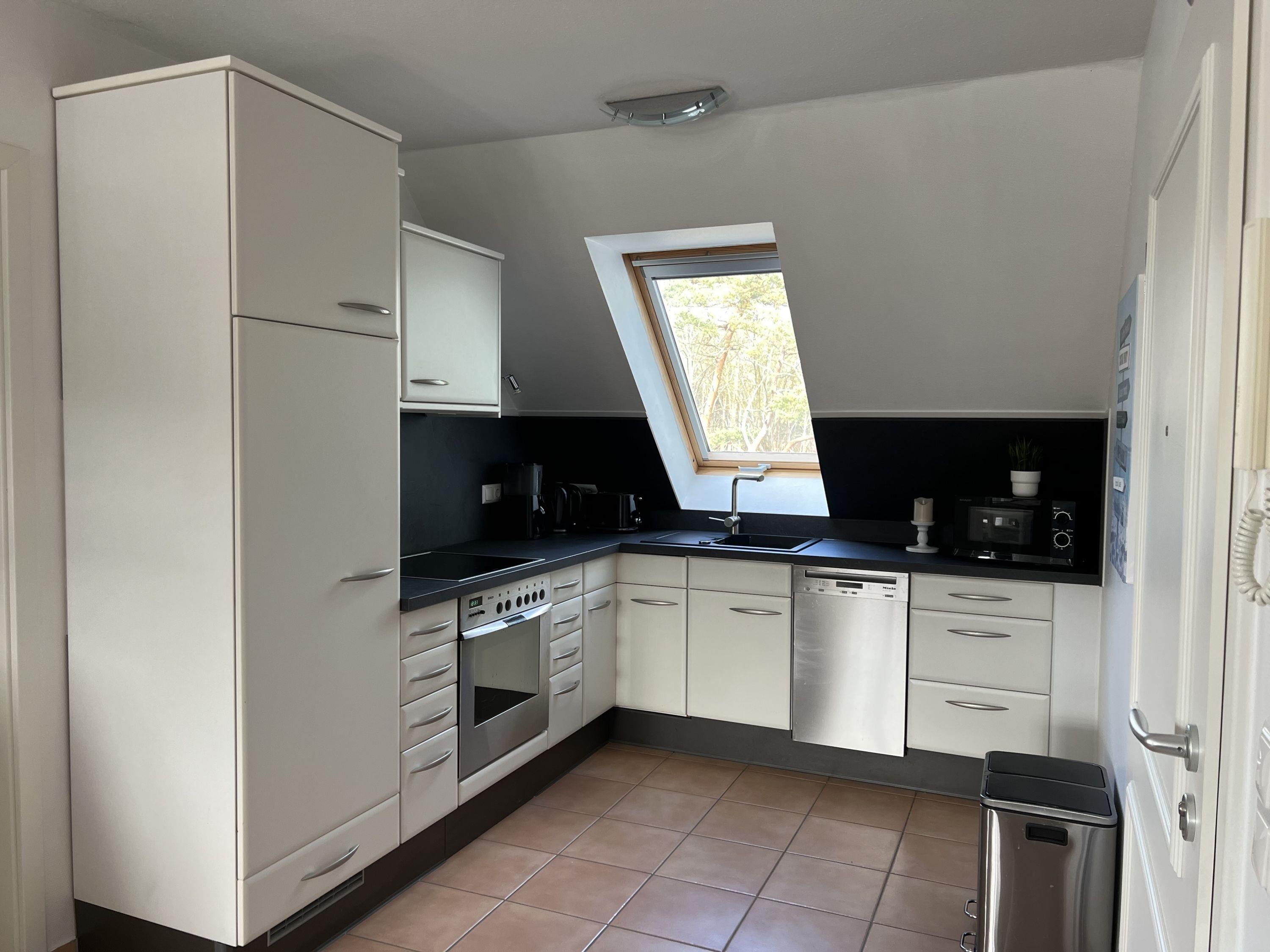 Der gemütliche Wohnbereich verfügt über eine Eckcouch, einen bequemen Sessel und einen Smart-TV. Hier können Sie sich von Ihren Ausflügen in und um Kühlungsborn entspannen. Die Einbauküche ist mit einem Backofen, Geschirrspüler und Mikrowelle ausgestattet und in den Wohnbereich integriert.