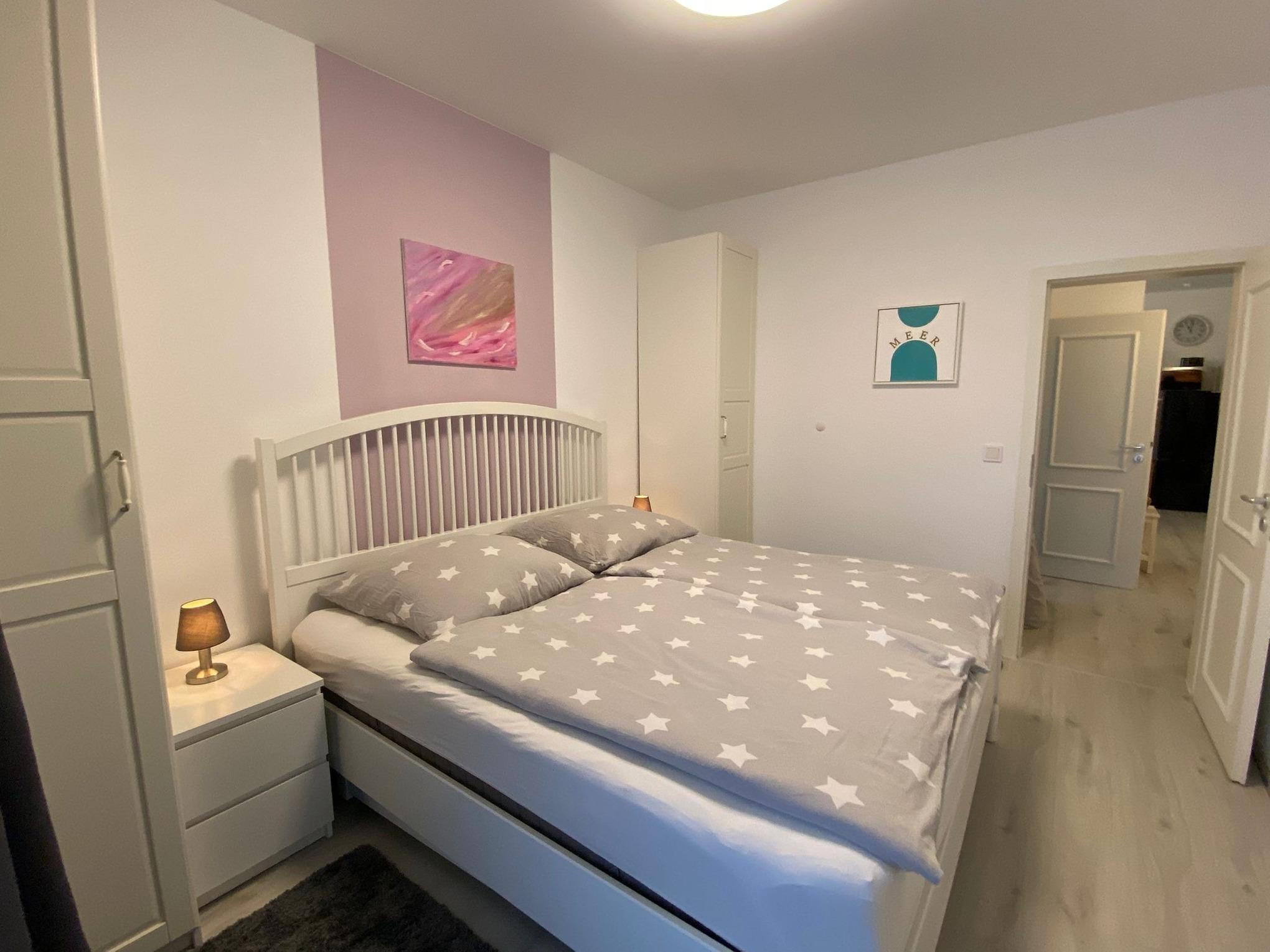 Im Schlafzimmer finden Sie ein Doppelbett vor.