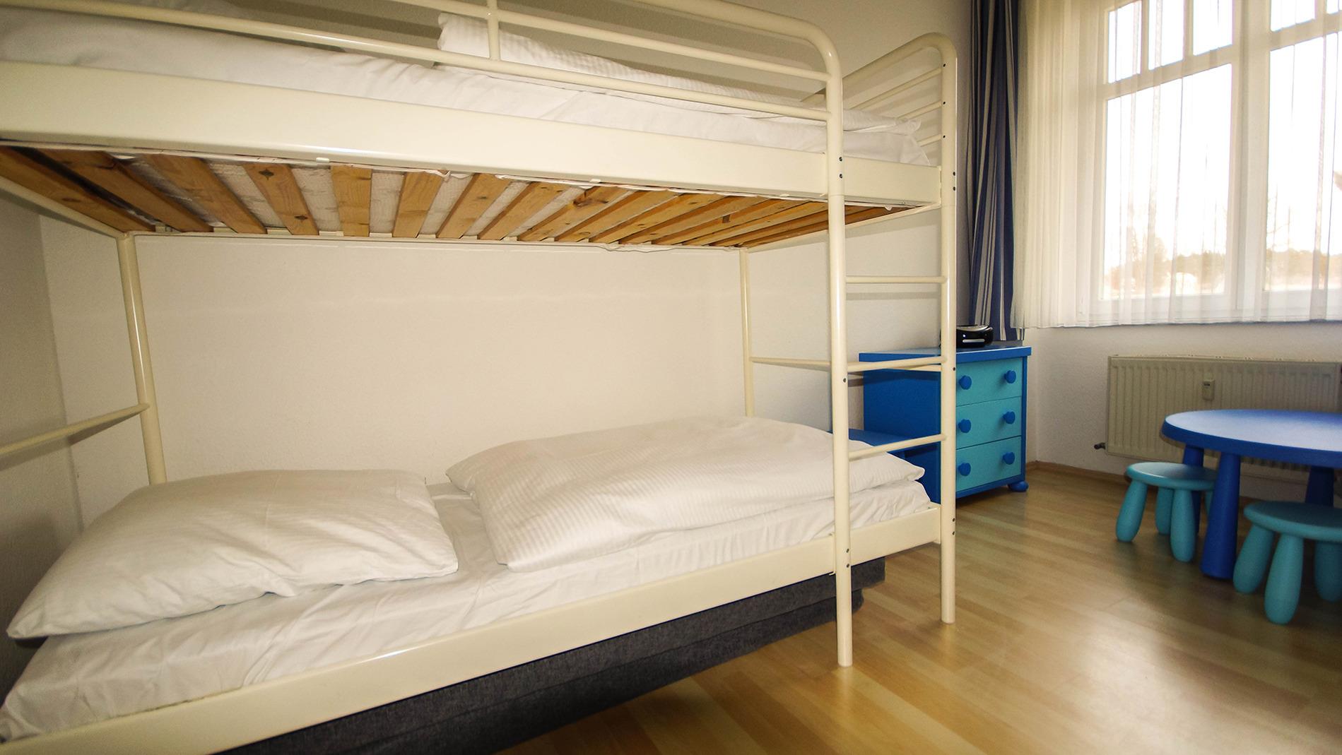 Die Fewo hat ein Schlafzimmer mit Doppelbett und ein Schlafzimmer mit Etagenbett.