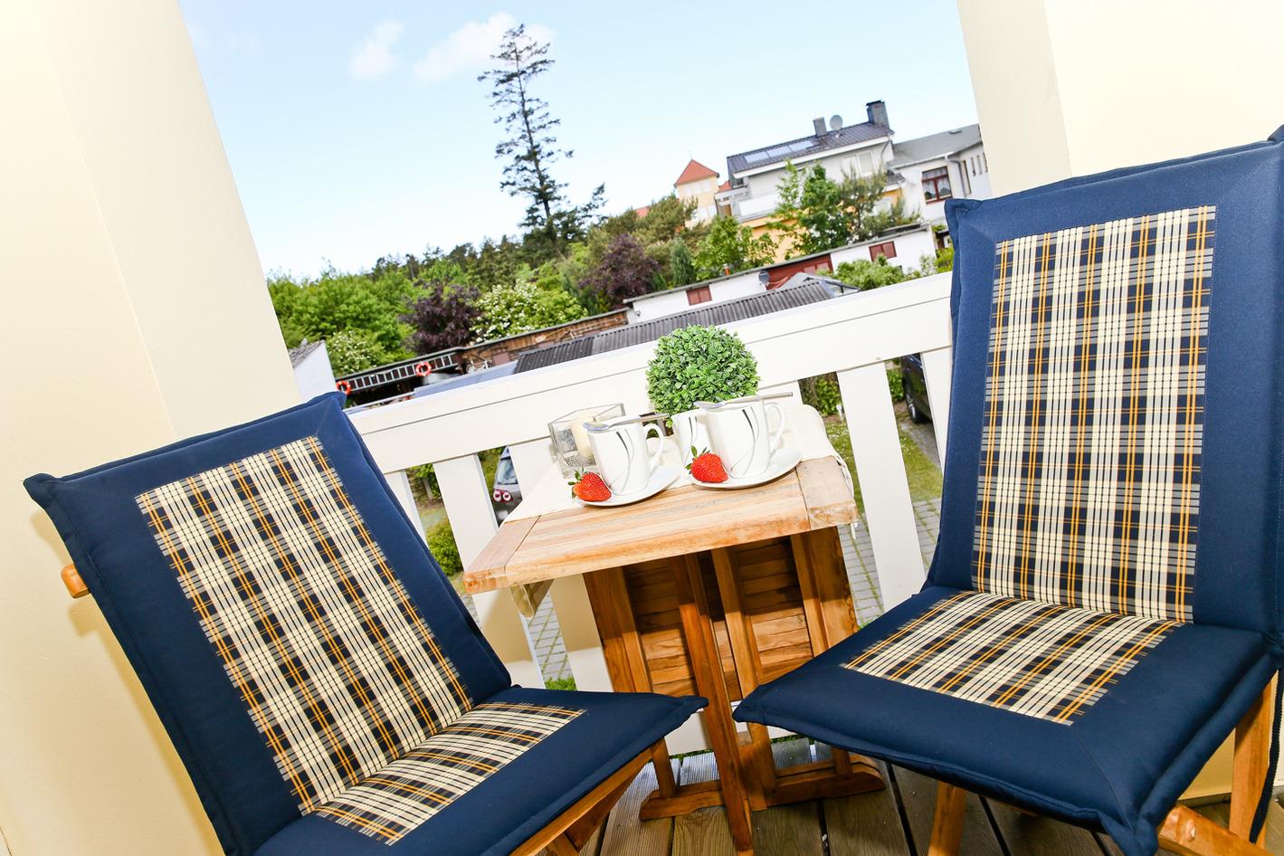 Den überdachten Balkon erreichen Sie vom Wohnzimmer aus.