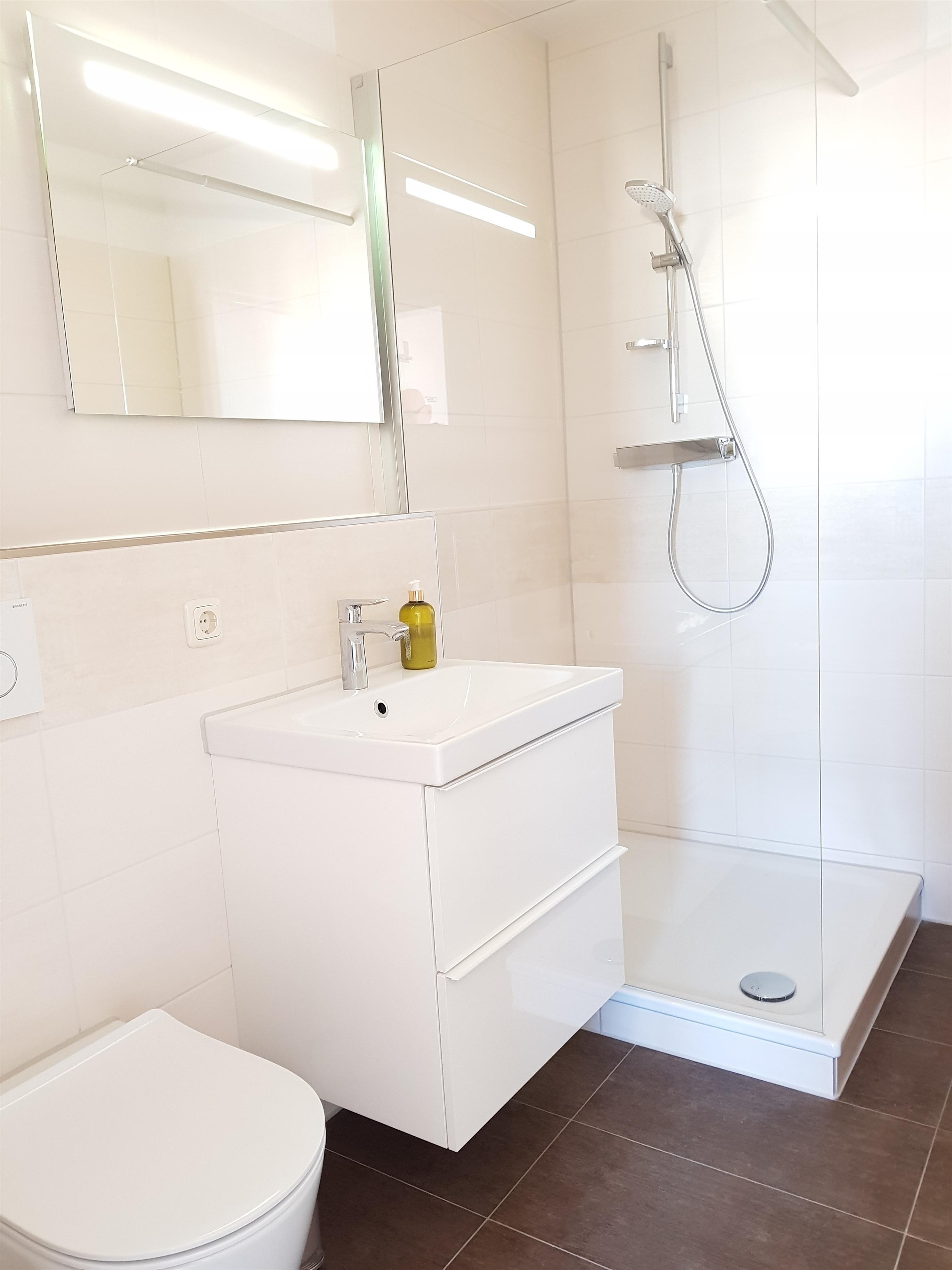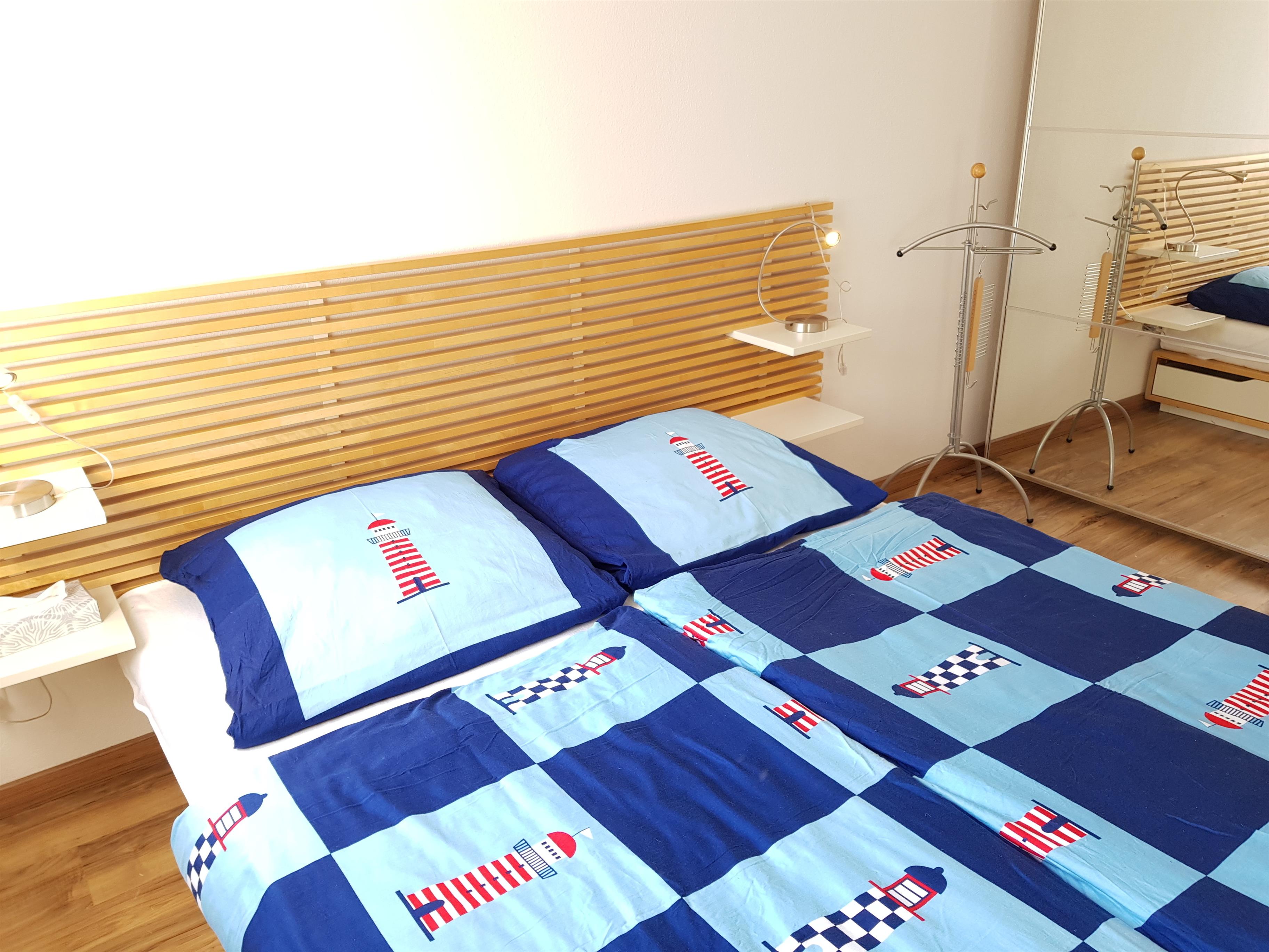 Die Wohnung ist für drei Personen eingerichtet und verfügt über 2 Schlafzimmer, eines mit Doppelbett sowie großem Kleiderschrank und das andere mit einem Einzelbett und einer Kommode als Ablagemöglichkeit. Im Badezimmer haben Sie genügend Ablageflächen ein WC und eine Dusche.