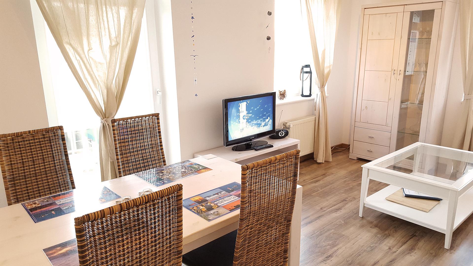 Die 60 m² Wohnung im 2. OG ist sehr komfortabel mit hellen Möbeln eingerichtet. Neben einer komplett ausgestatteten Küchenzeile mit Backofen, 4-flammigen Ceranfeld, Spülmaschine, Toaster, Wasserkocher und vielem mehr gehört ein hochwertige Couch[nbsp] genauso zur Ausstattung wie Kabel-TV im Wohnraum und Stereoanlage mit CD-Player.