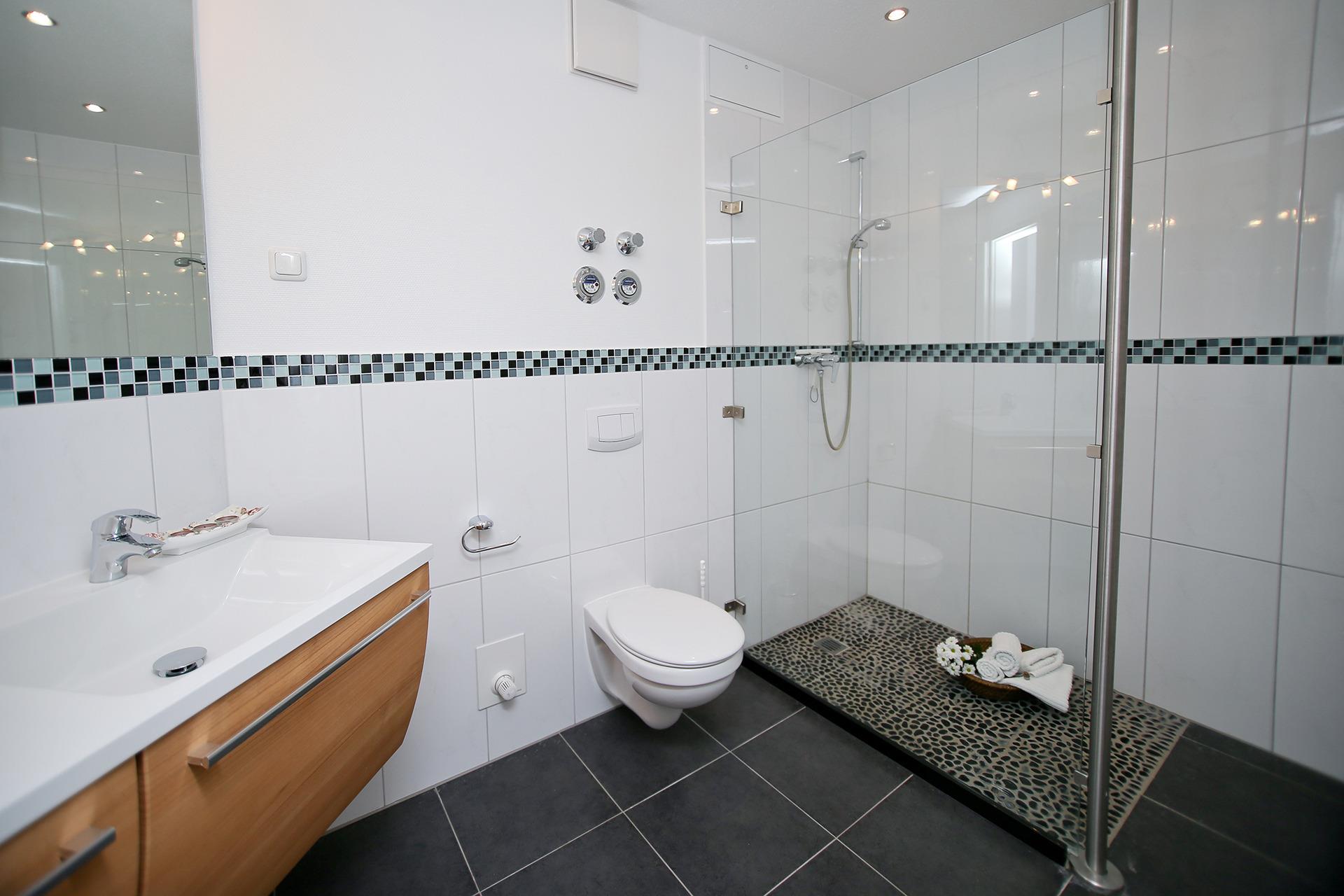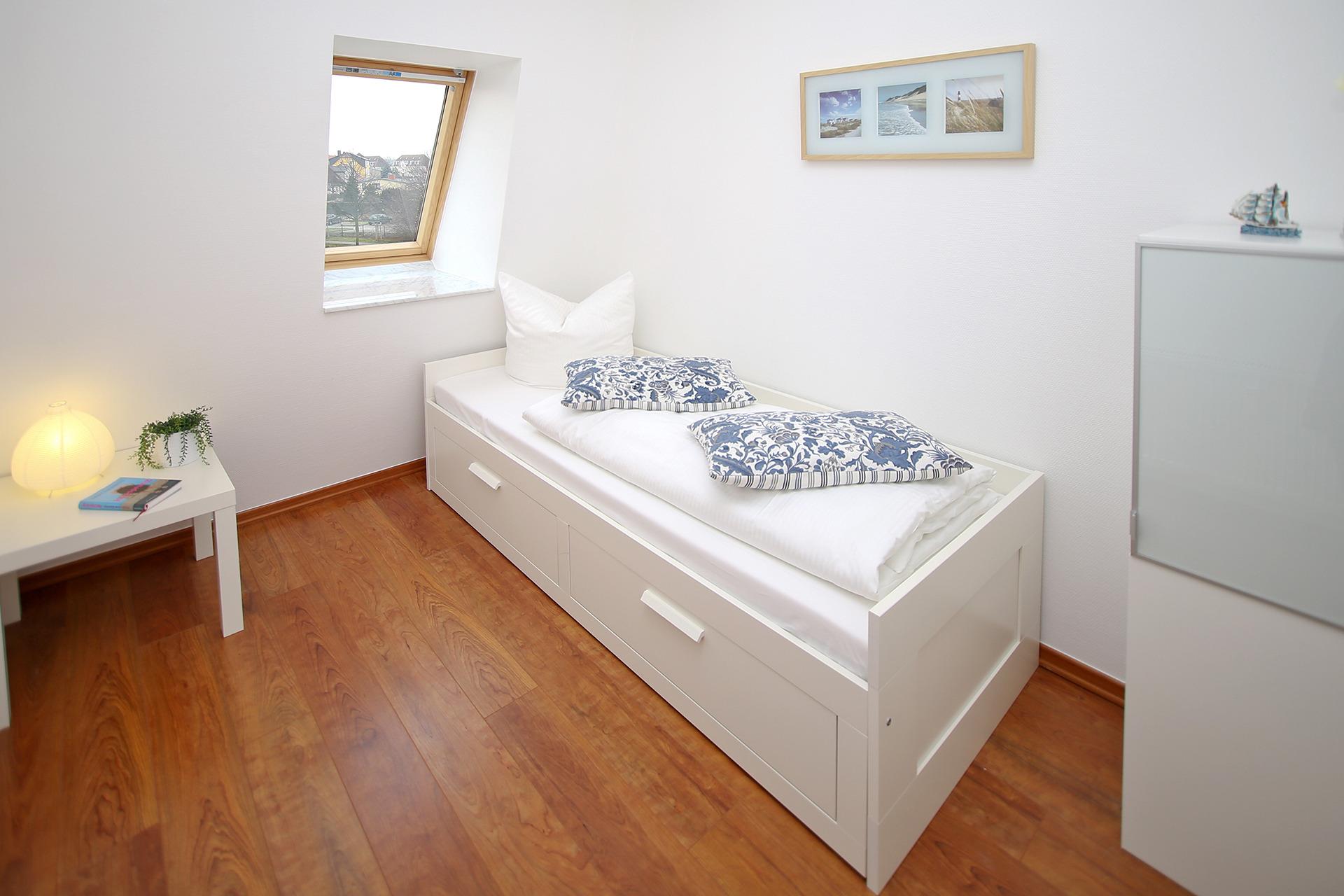 Das Schlafzimmer ist ausgestattet mit einem Doppelbett sowie großem Kleiderschrank. Das zweite Schlafzimmer verfügt über ein Einzelbett, welches zu einem Doppelbett ausgeklappt werden kann. Ein Duschbad/WC mit ebenerdigem, großzügigem Duschbereich ergänzt die Ferienwohnung.
