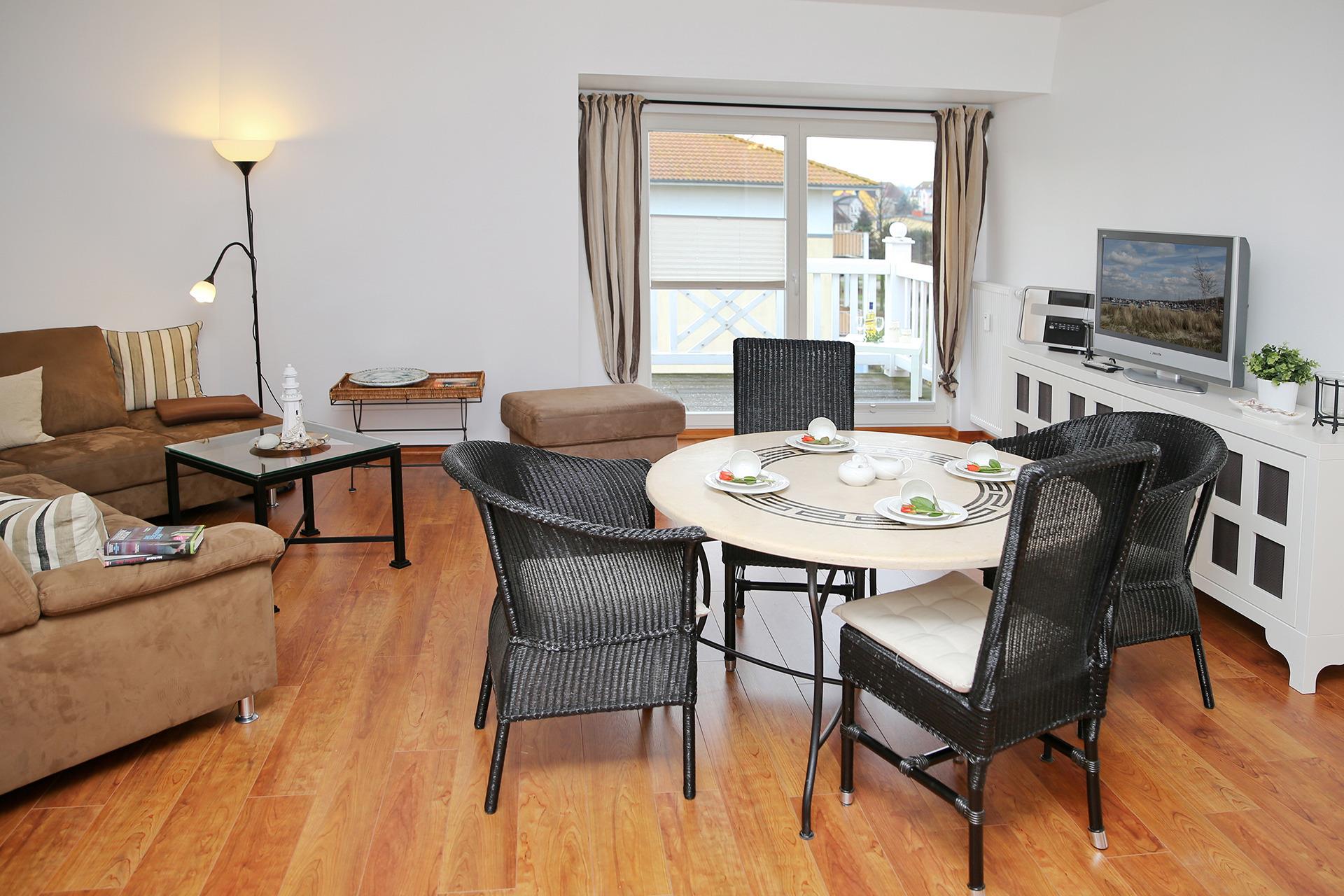Der Wohnbereich bietet eine Sitzgruppe mit Couch, TV und Stereoanlage sowie den Essbereich.