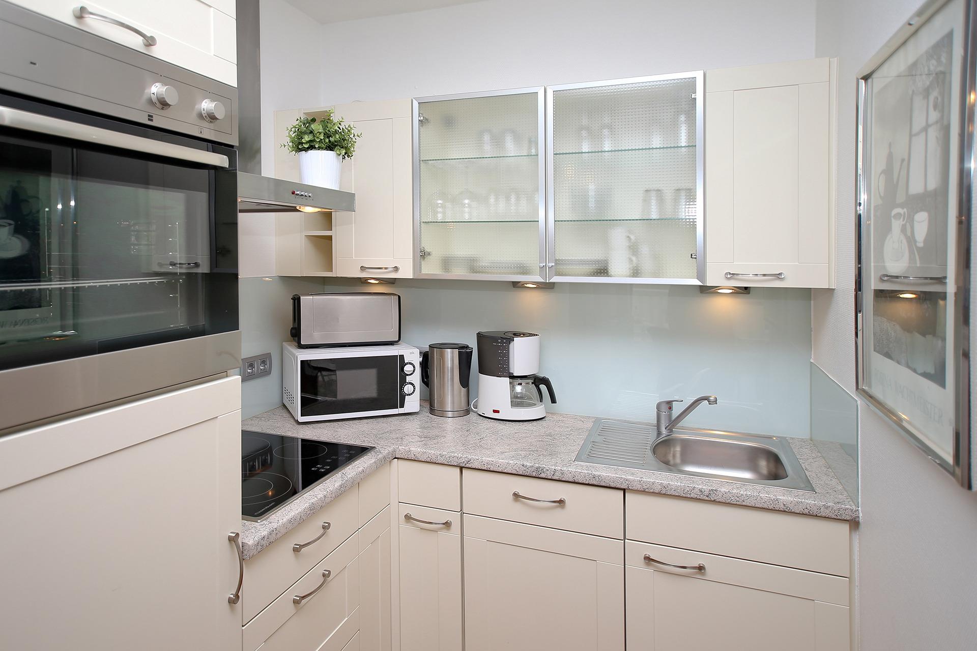 Die moderne Küchenzeile mit Geschirrspüler, Backofen und Ceranherd ist im Wohnbereich integriert.