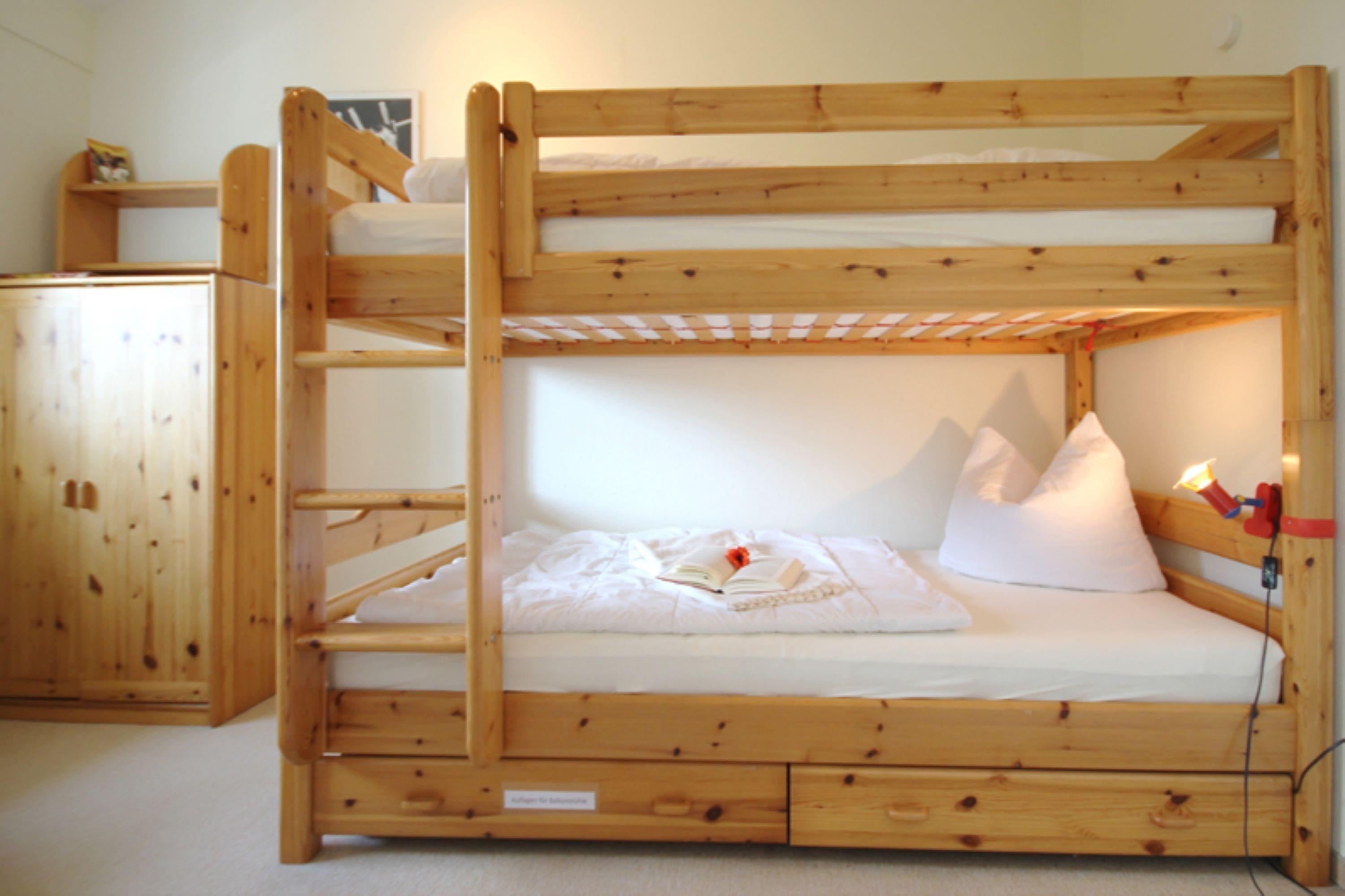 Das Schlafzimmer mit Doppelbett bietet zwei Schlafmöglichkeiten, im Kinderzimmer befindet sich ein Etagenbett.