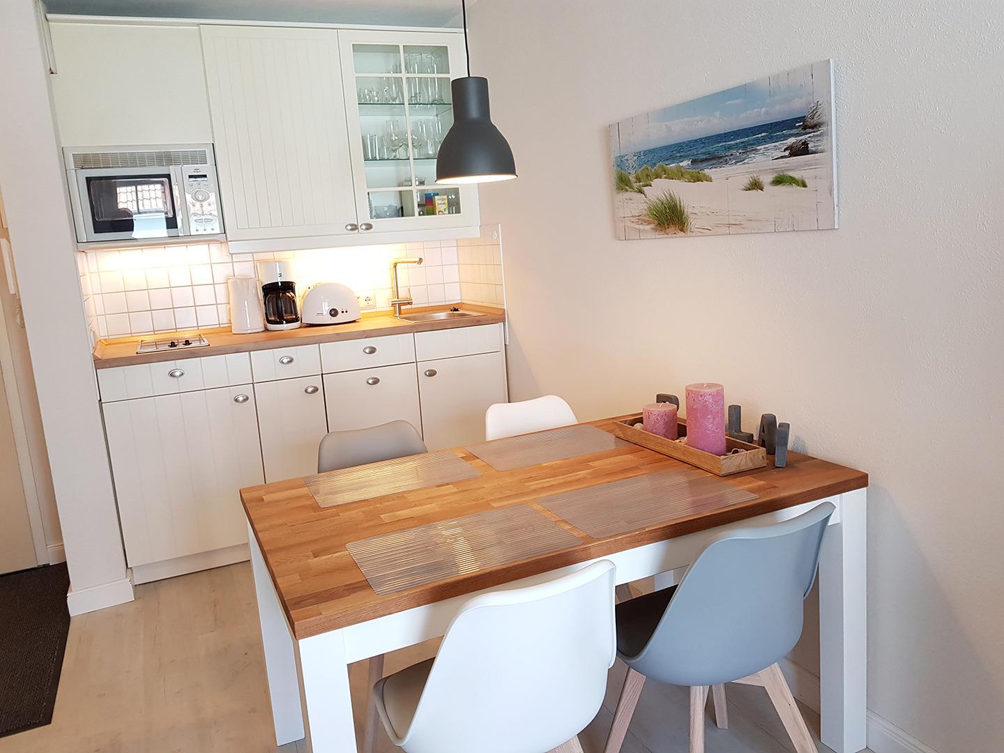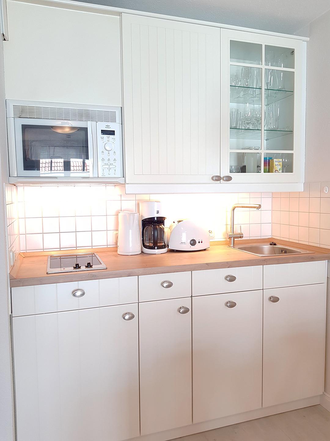 Im Wohnbereich ist eine neue Küchenzeile mit Mikrowelle und Geschirrspüler integriert.