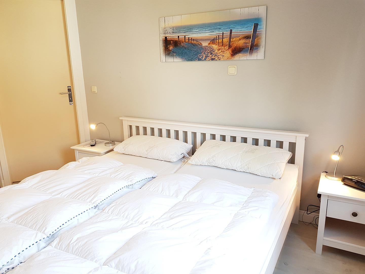 Das Schlafzimmer mit Doppelbett bietet zwei Schlafmöglichkeiten. Der Wohnbereich ist mit einer Doppelschlafcouch und einem Esstisch eingerichtet.