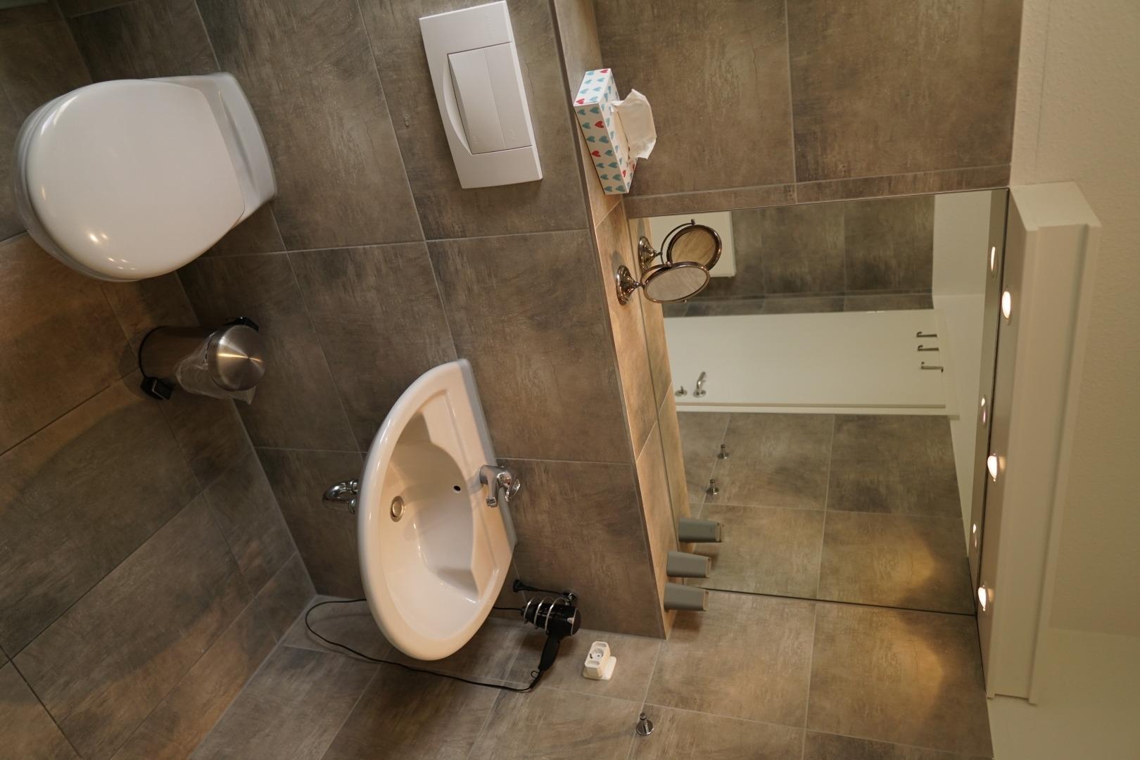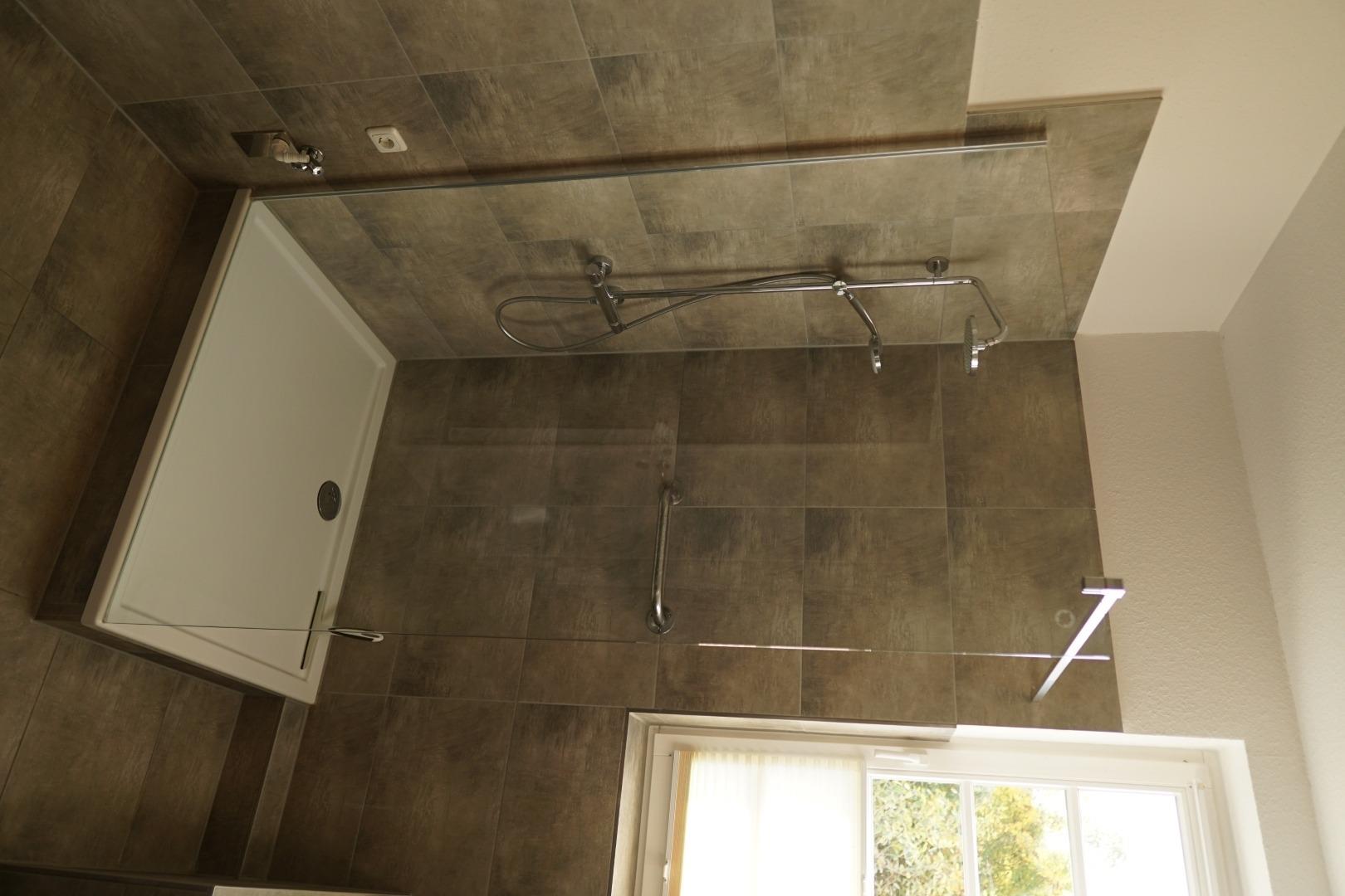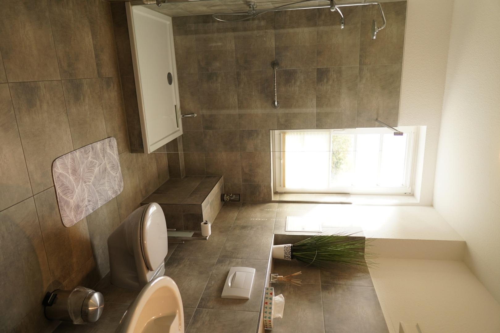 Das moderne und komplett neu sanierte Bad ist mit einem WC und einer großen Dusche mit leichtem Zugang ausgestattet.