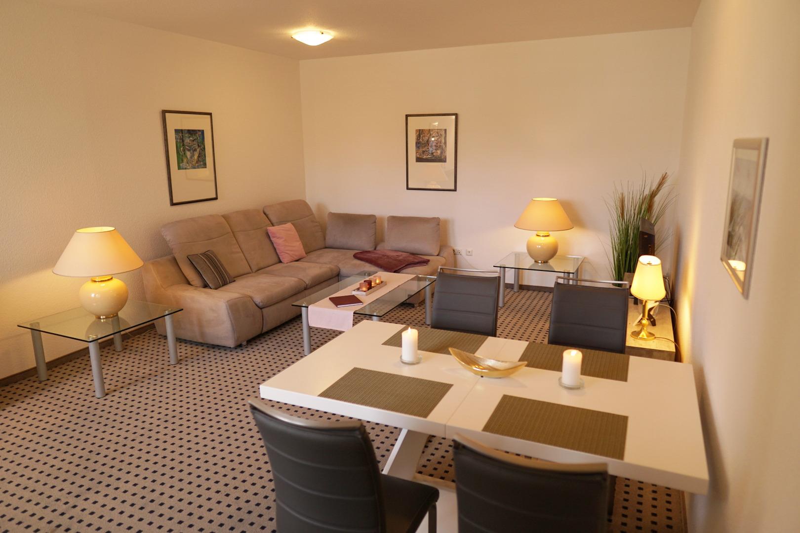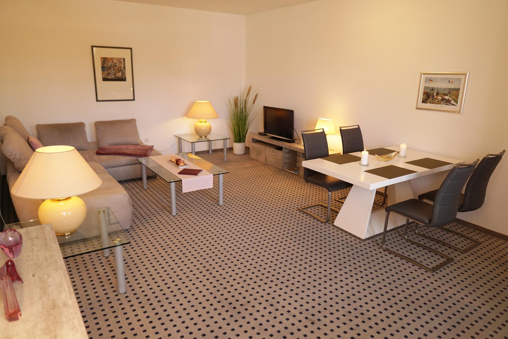 Das Wohnzimmer ist mit einer großen gemütlichen Eckcouch mit Bettkasten und Schlaffunktion sowie einen Esstisch für 4 Personen eingerichtet.