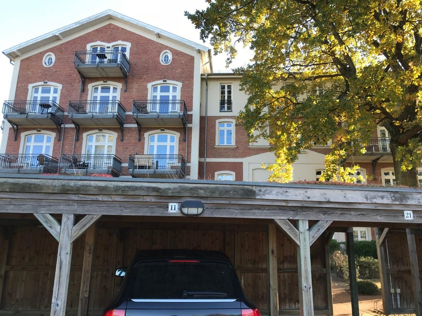 Den überdachten Stellplatz Nr. 11 direkt hinter dem Haus, können Sie bei Bedarf nutzen (max. Einstellhöhe 2 m).