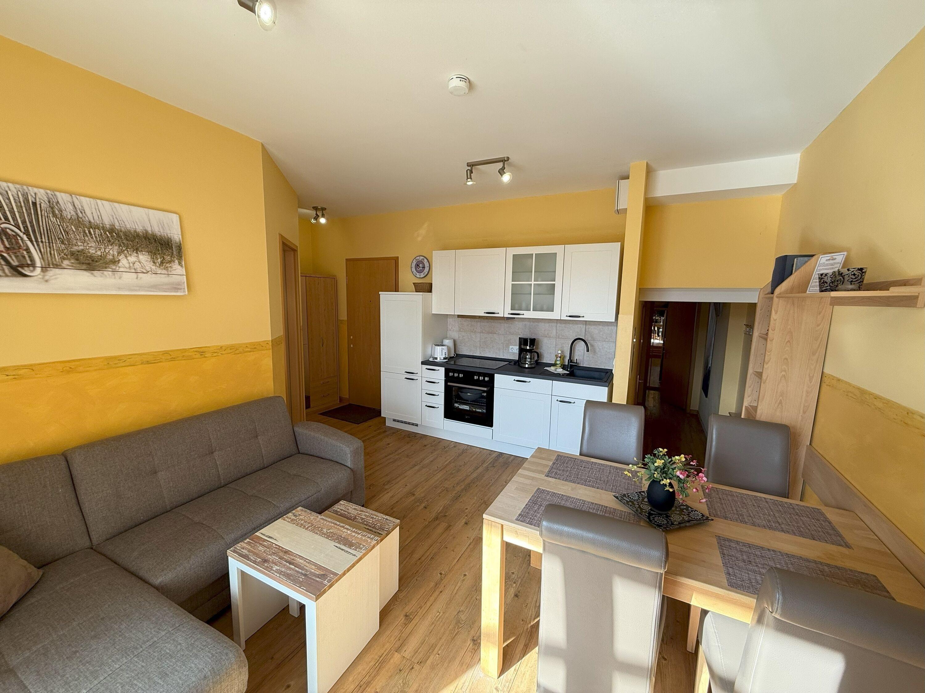 Die praktische und komfortable Ferienwohnung besitzt unter anderem eine offene Küche, 2 Schlafzimmer und einen Wohnraum mit gemütlicher Sofa-Ecke mit Blick zum Ostbalkon.