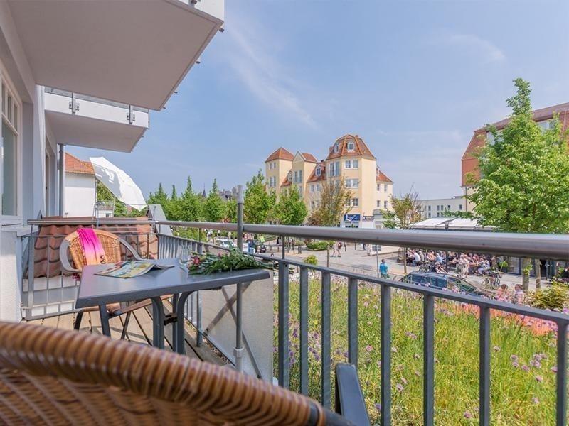 Von Ihrem sonnigen Balkon aus mit den wetterfesten Stühlen in Flecht-Optik und dem Bistro-Tisch hat man die Strandstraße bestens im Blick. Auf diesem Platz mit Süd-Ost-Lage können Sie die Sonne bis in den frühen Nachmittag hinein genießen.