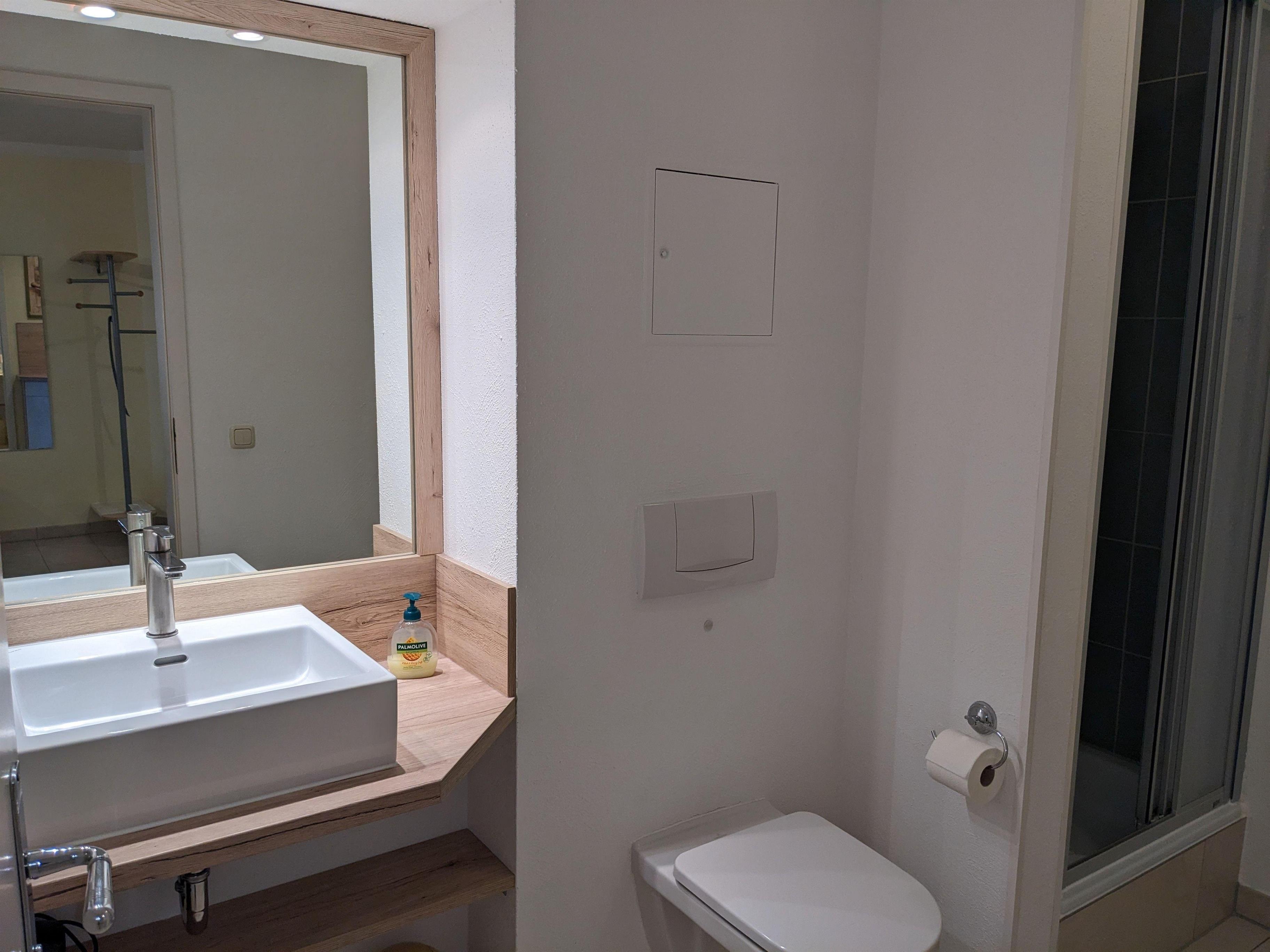 Das puristische Badezimmer mit weißen Wandfliesen ist innen liegend und bietet neben der Dusche einen Waschtisch mit Unterkommode und großer Spiegelfläche sowie zahlreiche Haken für Handtücher.