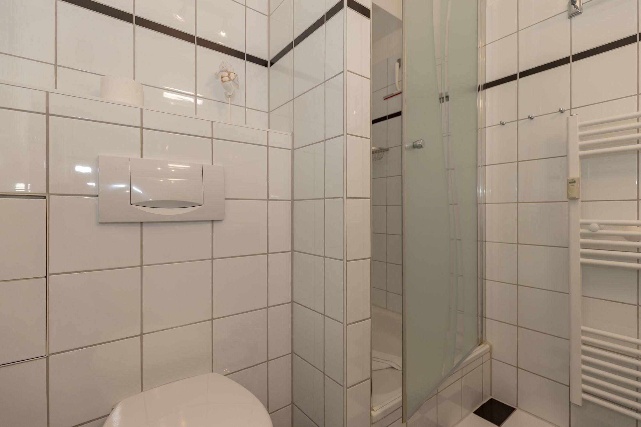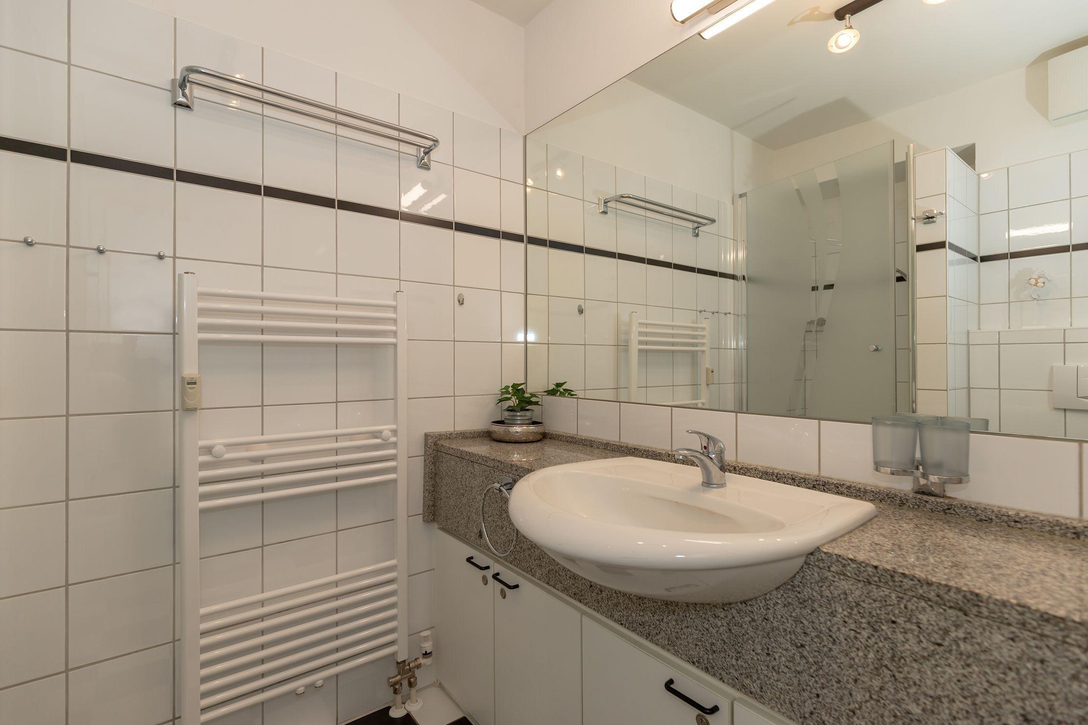 In dem modernen, mit Granit ausgestatteten Bad befindet sich neben Dusche und WC ein großer Waschtisch mit geräumigem Unterschrank sowie einem großen Spiegel. Ihre kleine Wohlfühloase mit ausreichend Platz für Kosmetika sowie Föhn und Handtuchhalter!