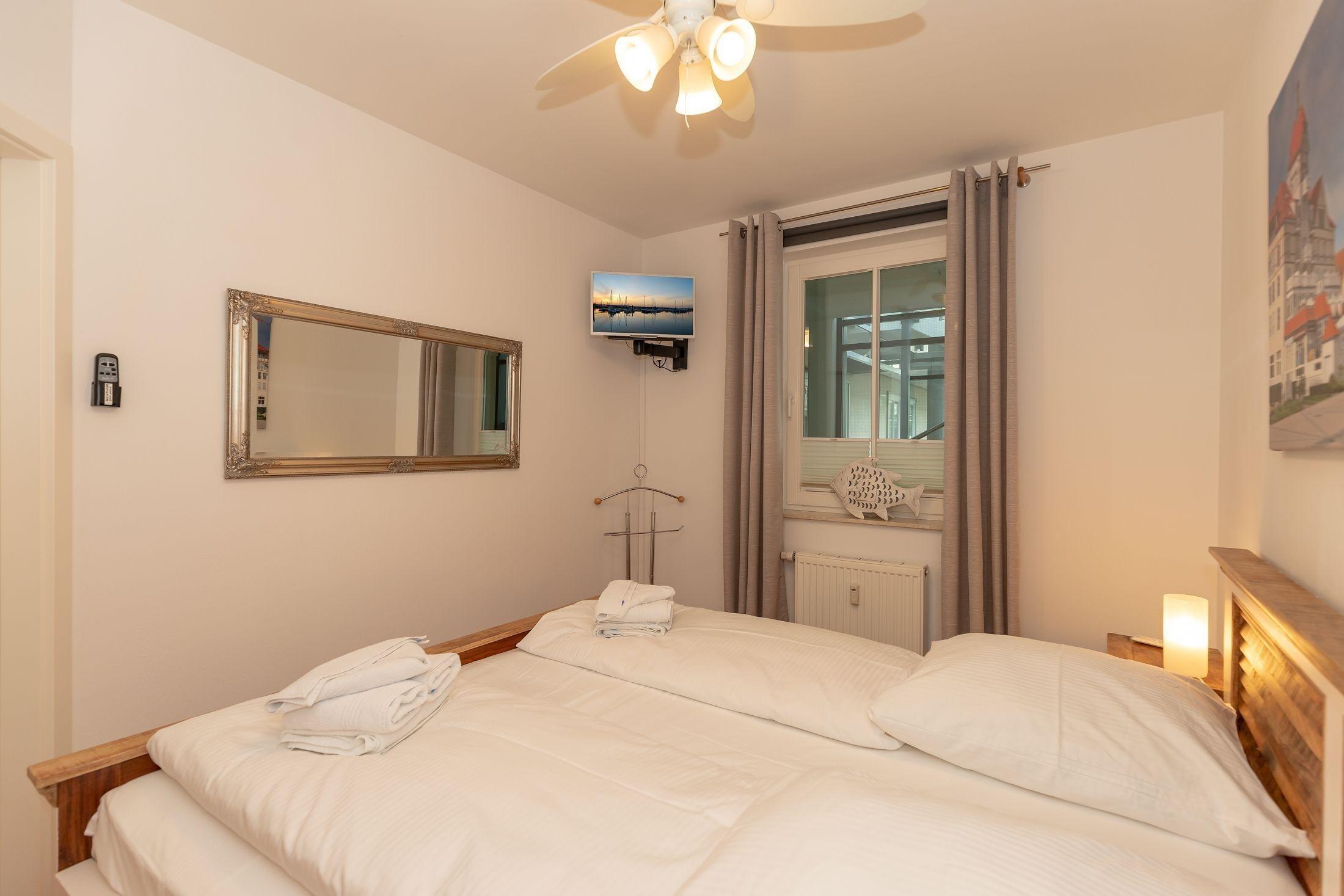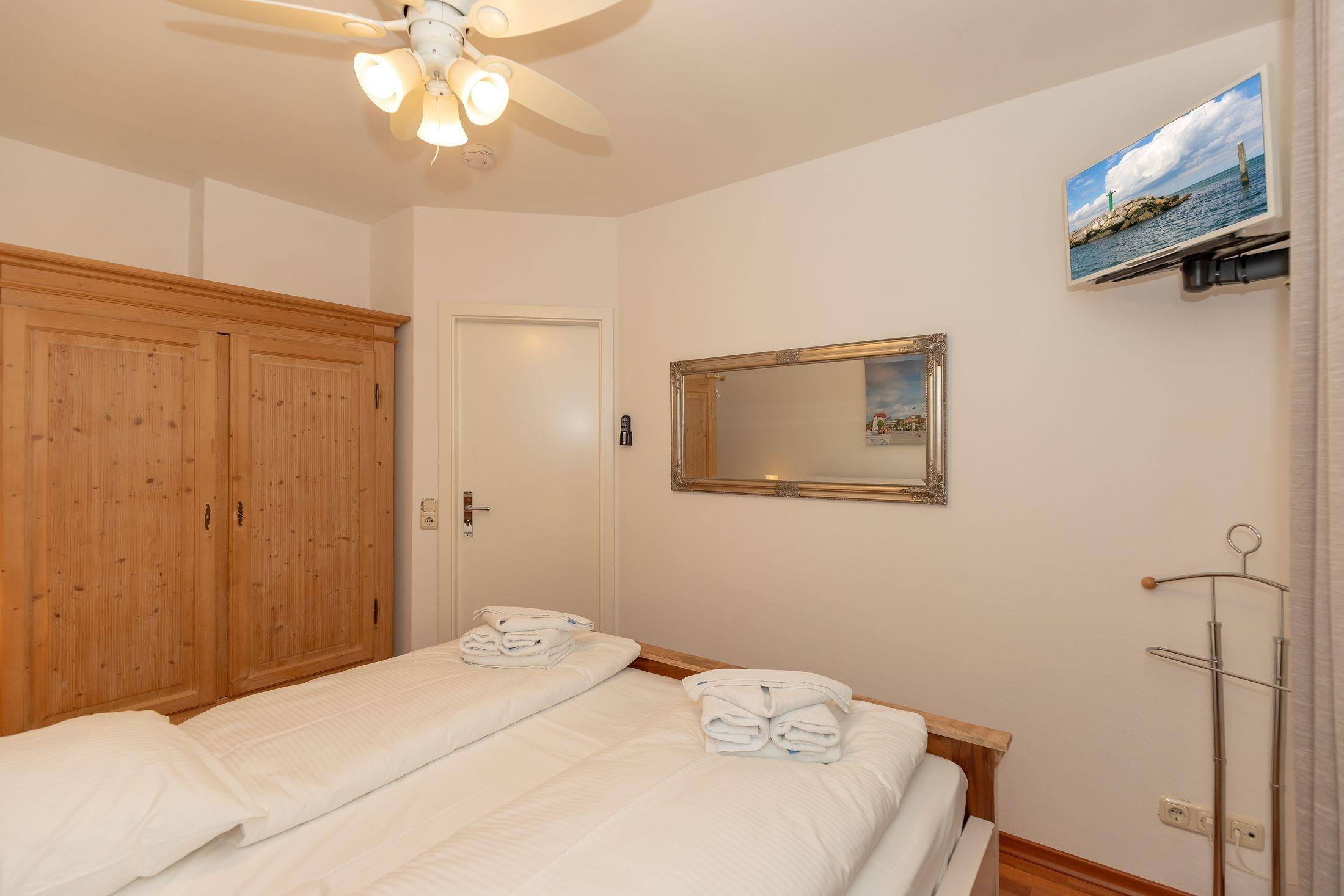 Im ersten Schlafzimmer erwartet Sie ein gemütliches Doppelbett, in dem es sich herrlich träumen lässt. Ein geräumiger Kleiderschrank bietet genügend Platz für Ihre Urlaubsgarderobe. Ein zusätzliches Fernsehgerät unterstreicht den Komfort dieses Zimmers.