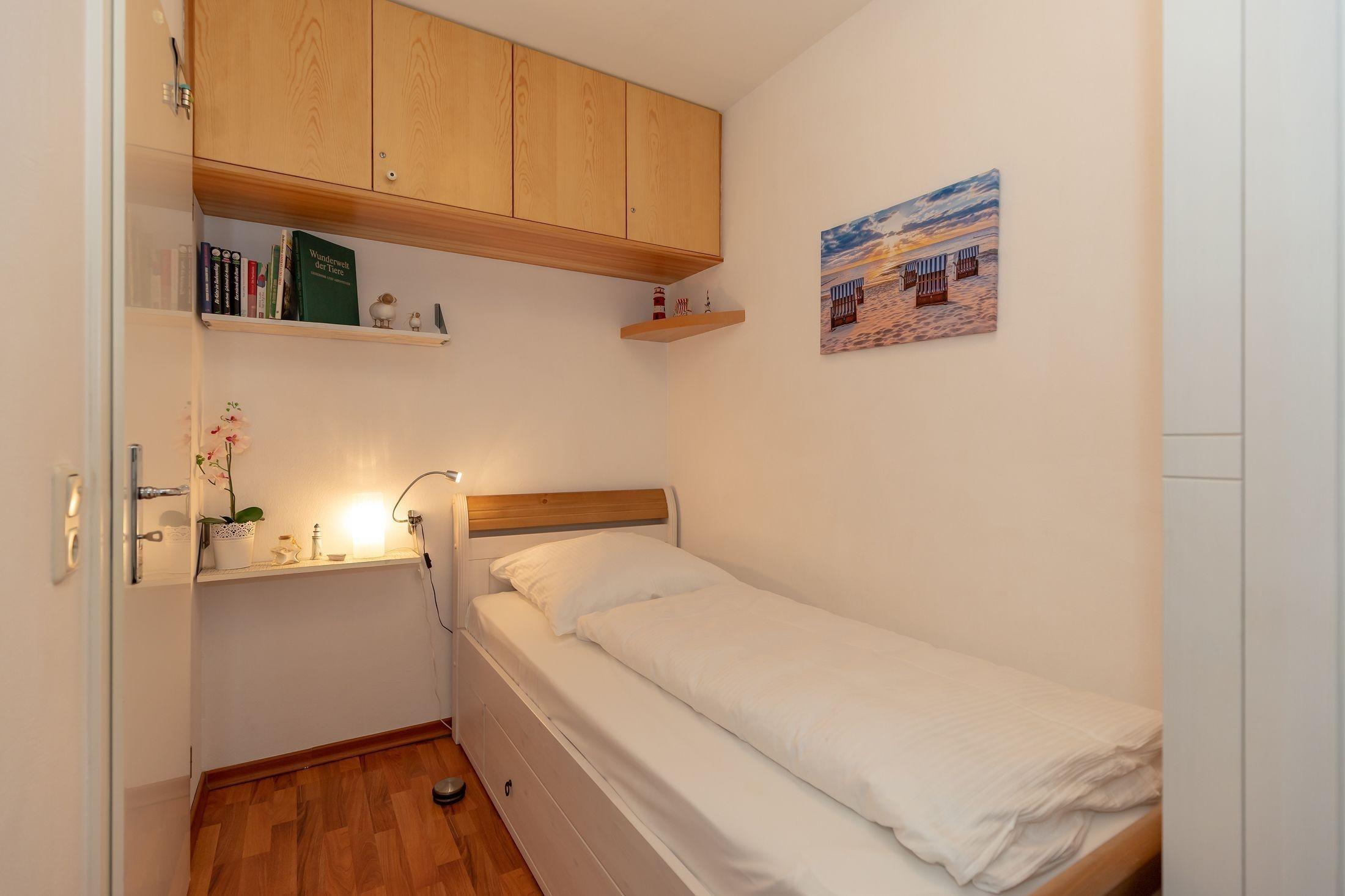 Das zweite Schlafzimmer ist mit einem Einzelbett sowie einem weiteren Kleiderschrank ausgestattet.