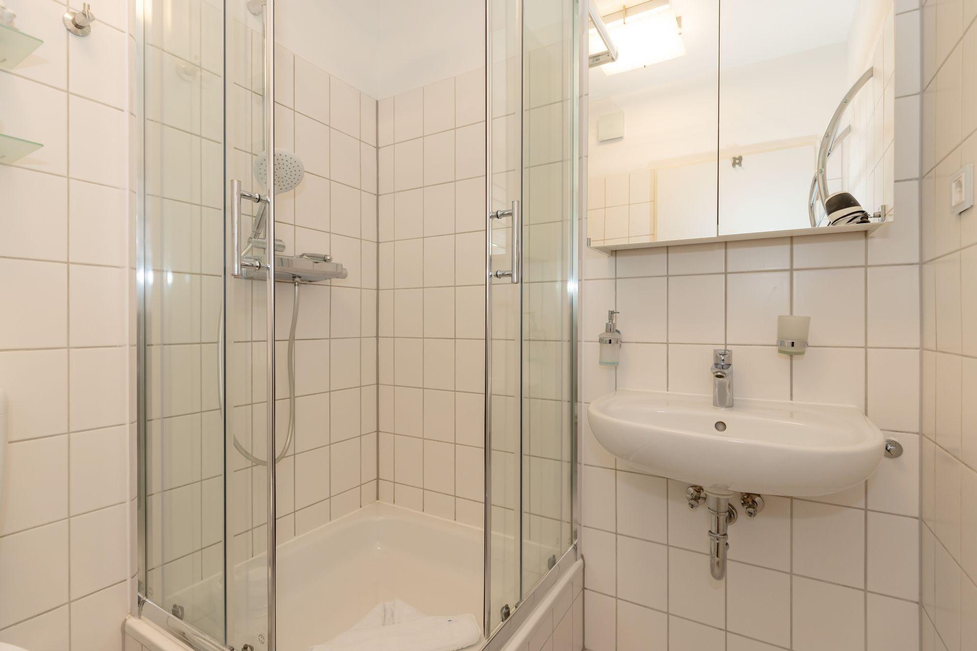 Das Badezimmer ist mit Dusche und WC ausgestattet. In der Dusche finden Sie eine Handbrause sowie eine Regendusche.