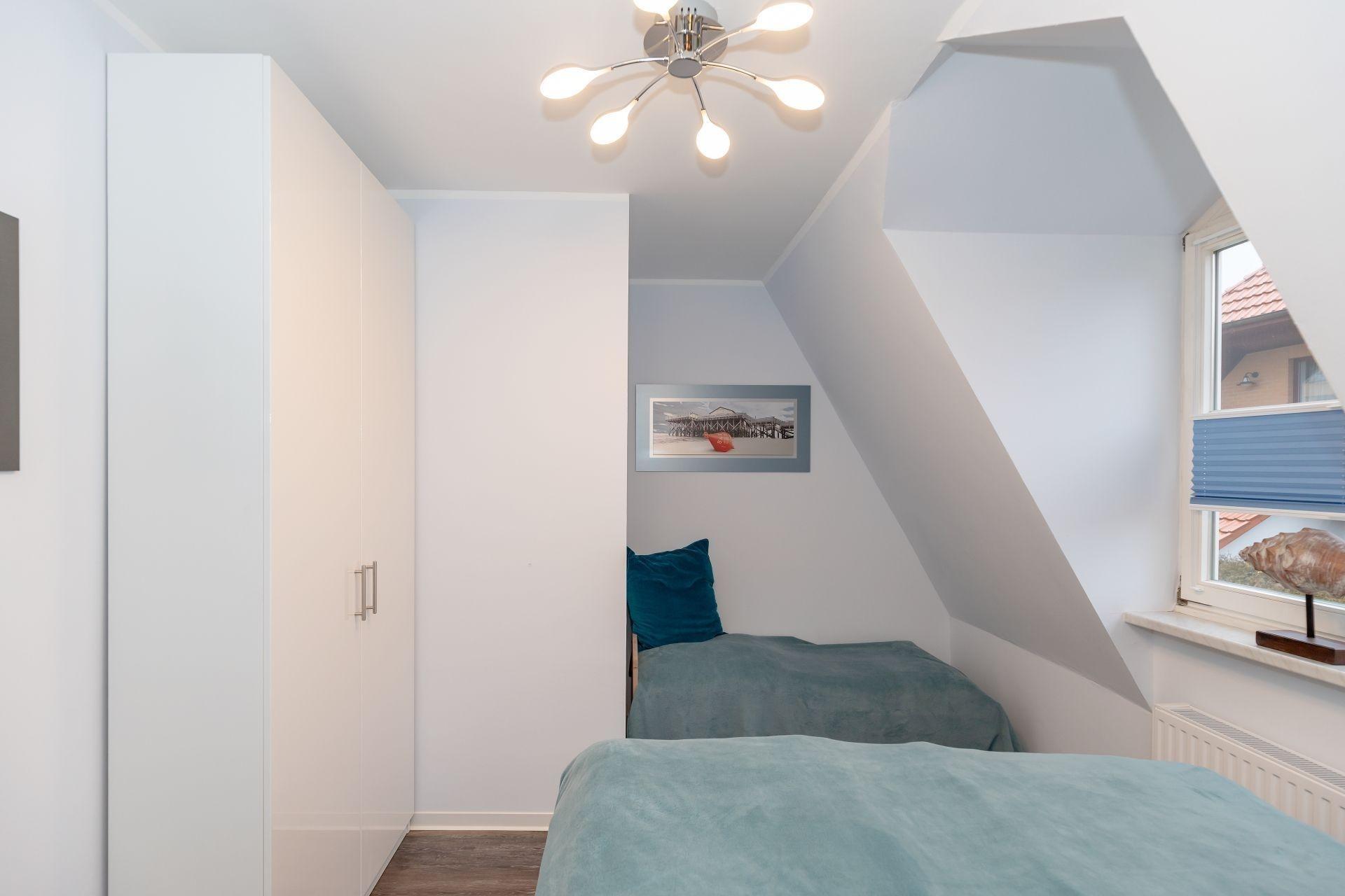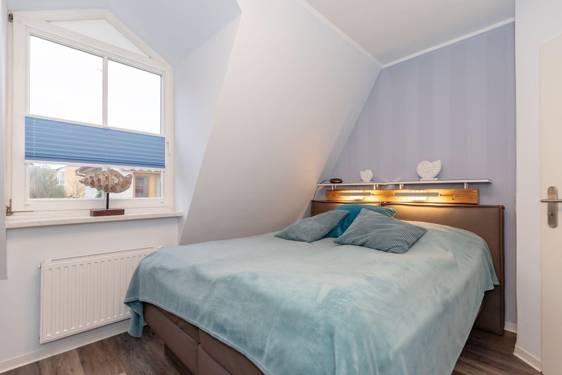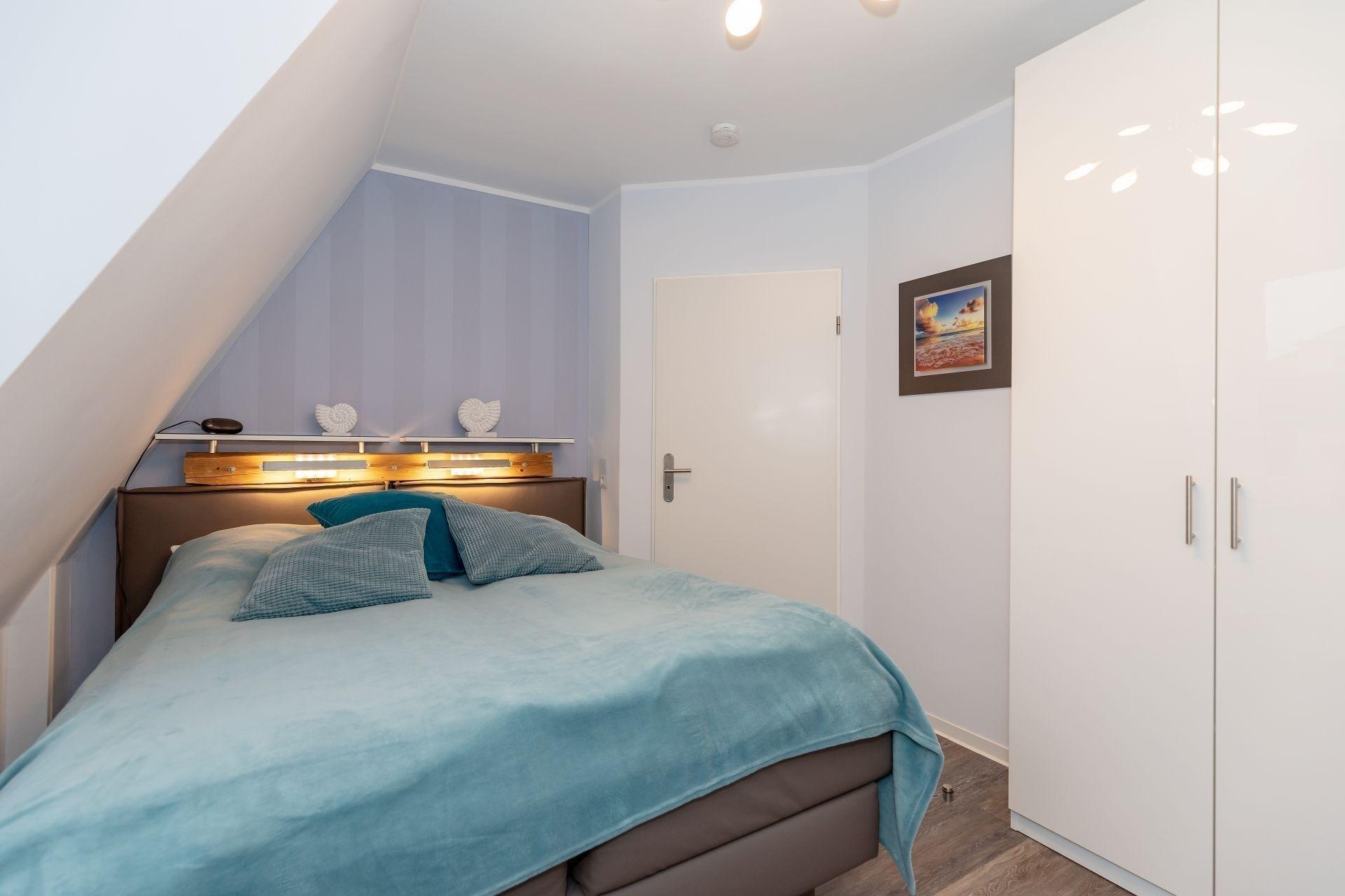 Das Schlafzimmer lädt zu einem Erholungsschlaf ein und der große Kleiderschrank sorgt dafür, dass die Urlaubsgarderobe sicher verstaut werden kann. Ein Extrabett für Kinder gehört auch zur Ausstattung.